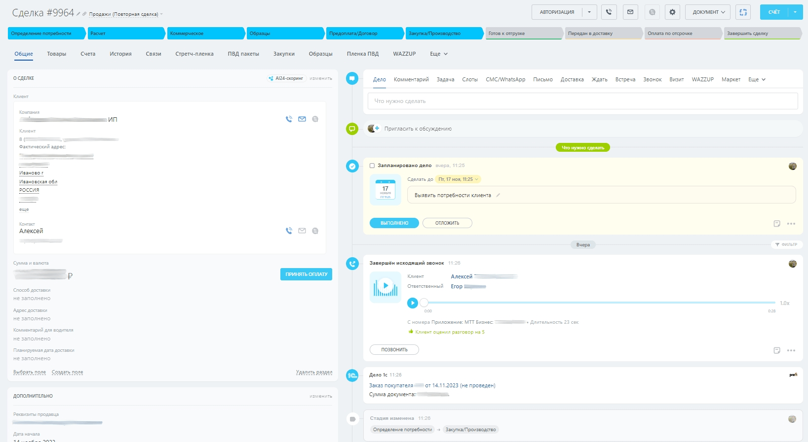 Собрали все нужные данные по сделке (заказу) в одном месте: это и данные клиента, сумма, способ, планируемая дата и адрес доставки, планируемая дата отгрузки и др. данные, которые в любой момент можно зайти и посмотреть.