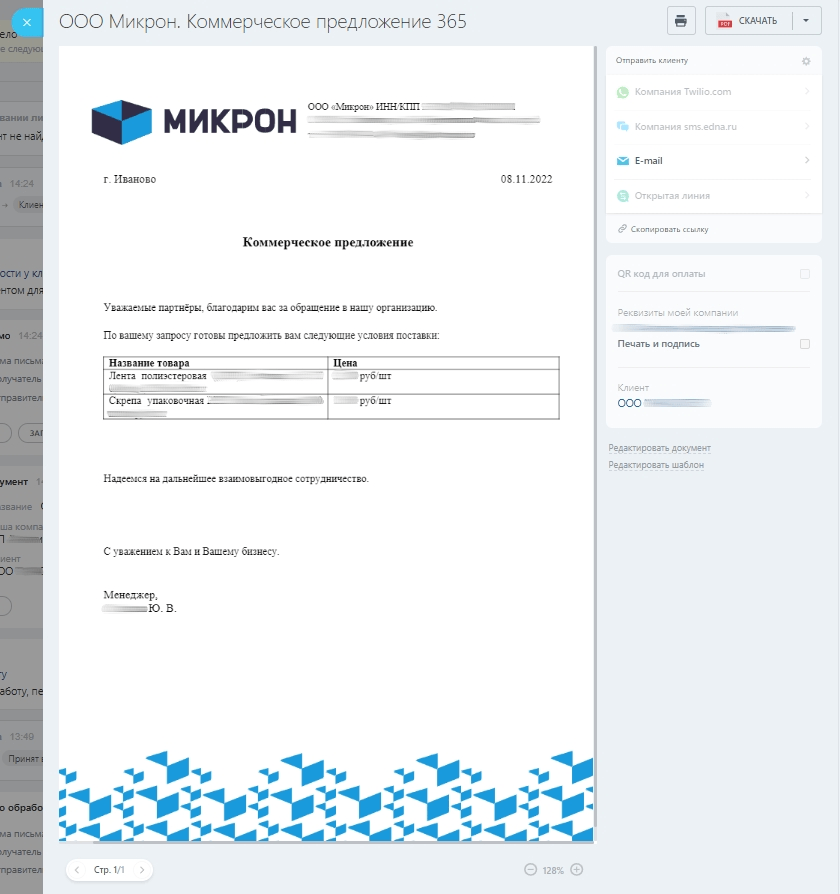 В самих карточках сотрудники генерируют в пару кликов коммерческие предложения, договора, счета и сразу в этом же окне отправляют документ клиенту по почте.