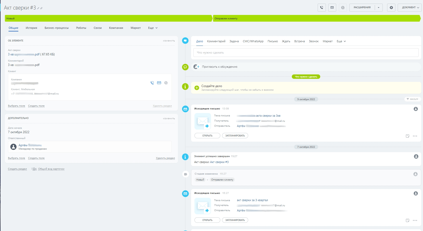 В самой карточке акта виден процесс коммуникации — письма клиенту и когда акт был отправлен.