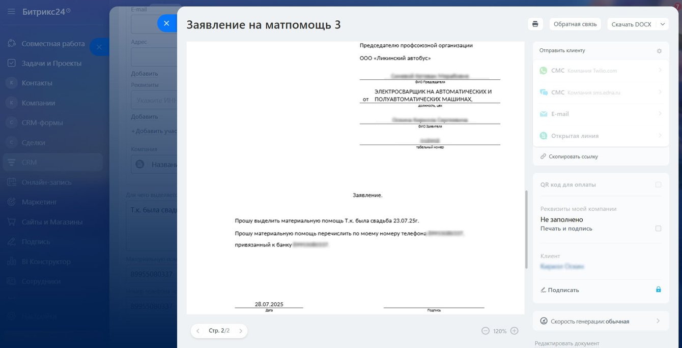 Целью проекта стало создание единой цифровой платформы для эффективного управления деятельностью ППО ООО «Ликинский автобус» путём автоматизации ключевых процессов: вступления и выхода из профсоюза, регистрации на мероприятия, оказания материальной помощи и обработки обращений. До внедрения эти процессы осуществлялись вручную или в разрозненных системах, что снижало прозрачность и оперативность. В рамках проекта была построена структура профсоюза, загружены контакты членов и шаблоны документов, настроены бизнес-процессы и CRM-воронки. Теперь при поступлении заявки система автоматически создаёт лид или сделку, сопровождаемую сотрудником от начала до завершения: с проверкой данных, консультацией, генерацией документов и фиксацией результата.