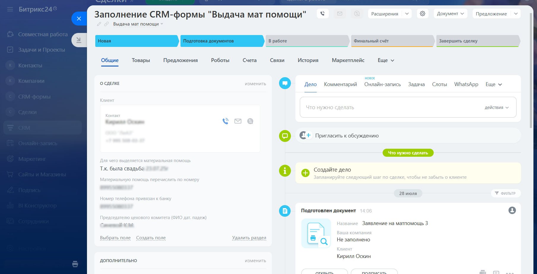 При поступлении обращения через форму на сайте или из других каналов (почта, соцсети) система автоматически создаёт лид или сделку, которая попадает в воронку обработки. Сотрудник оперативно берёт заявку в работу: проверяет данные, уточняет информацию, консультирует заявителя и сопровождает процесс до закрытия. На каждом этапе CRM автоматически генерирует необходимые документы (заявления, согласия и др.), которые подписываются и сохраняются в системе. Все действия, переписка и статусы фиксируются централизованно, что обеспечивает прозрачность и контроль исполнения.