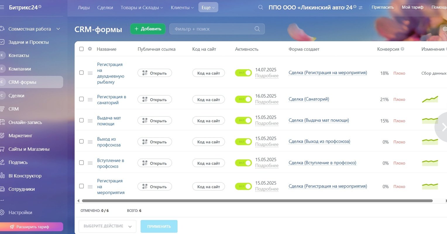 Целью проекта стало создание единой цифровой платформы для эффективного управления деятельностью ППО ООО «Ликинский автобус» путём автоматизации ключевых процессов: вступления и выхода из профсоюза, регистрации на мероприятия, оказания материальной помощи и обработки обращений. До внедрения эти процессы осуществлялись вручную или в разрозненных системах, что снижало прозрачность и оперативность. В рамках проекта была построена структура профсоюза, загружены контакты членов и шаблоны документов, настроены бизнес-процессы и CRM-воронки. Теперь при поступлении заявки система автоматически создаёт лид или сделку, сопровождаемую сотрудником от начала до завершения: с проверкой данных, консультацией, генерацией документов и фиксацией результата.