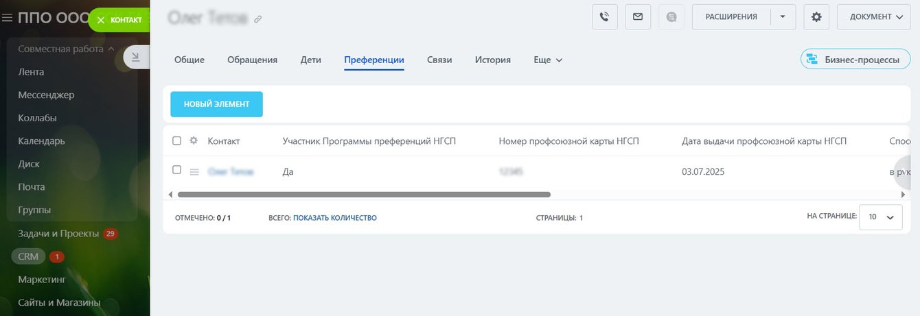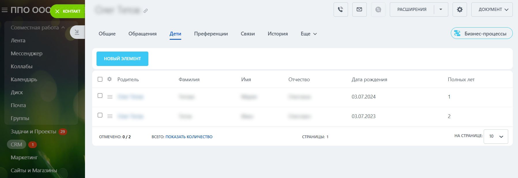 «Дети членов профсоюза» — с привязкой к родителю, расчётом возраста и отображением в карточке контакта, что упрощает организацию социальных и детских программ.