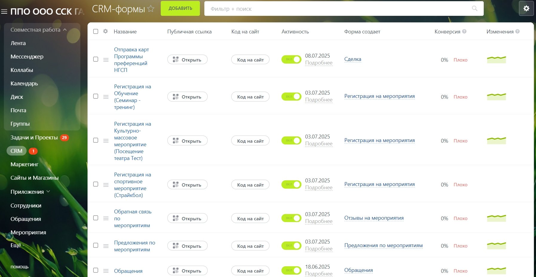 «Мероприятие» — охватывает три стадии: планирование, регистрация участников и сбор обратной связи. На этапе регистрации через CRM-форму автоматически создаются карточки участников, им приходит подтверждение и напоминания перед мероприятием. После события администратор отмечает посещаемость, а система автоматически отправляет форму отзыва только тем, кто присутствовал, и закрывает карточки с анализом результатов.