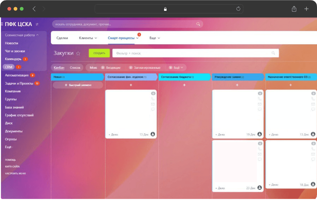 Клиенту требовалось оцифровать процесс закупок в компании и обеспечить сотрудникам доступ к полной информации по процессу закупок, который будет систематизирован и будет отображаться в CRM-системе.