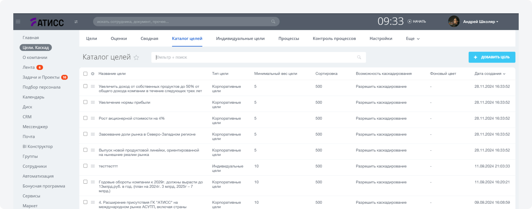 1. Управление целями. Каскад — для эффективной постановки и отслеживания целей сотрудников, а также их привязки к корпоративным целям. Благодаря этому модулю отделу или сотруднику можно ставить цели на месяц, квартал, год.