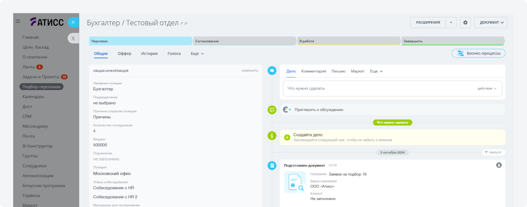 Удобный интерфейс для создания и сопровождения вакансий с возможностью контроля стадий отбора, согласования или отклонения заявок ответственными лицами, что улучшает качество и скорость найма новых сотрудников.