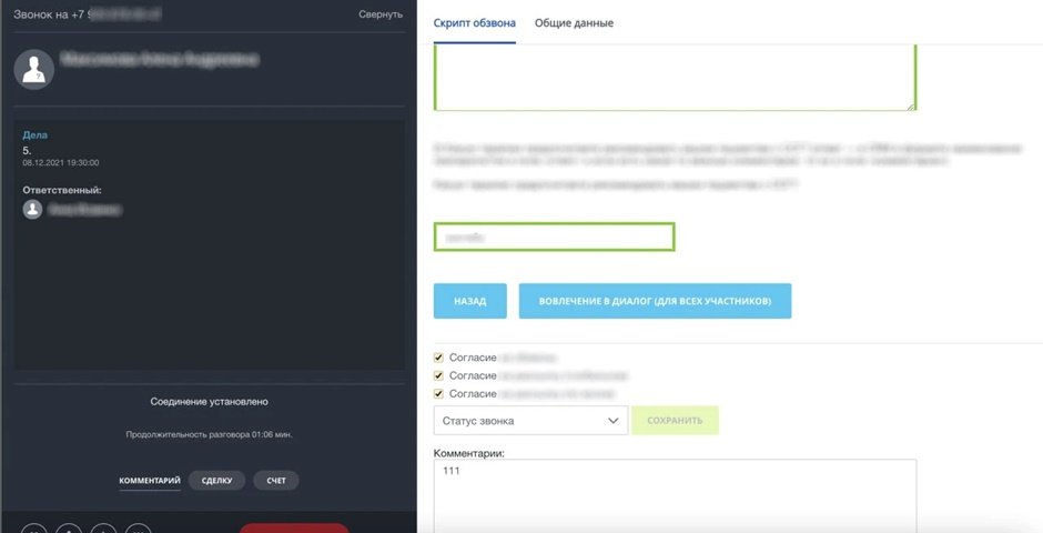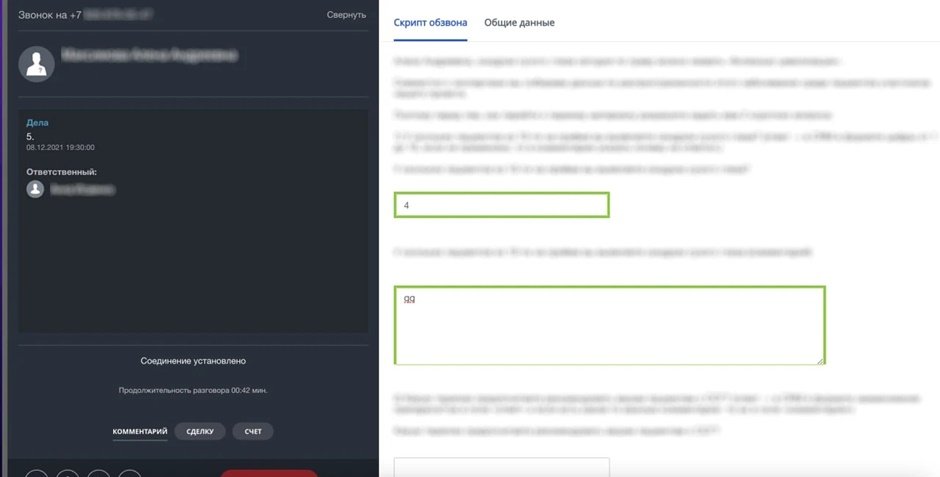 Скрипт позволяет не просто читать с экрана, но и заполнять информацию о контакте в процессе разговора. В системе показываются вопросы и поля для ответов, а оператор фиксирует данные, выбирая или вводя значения.