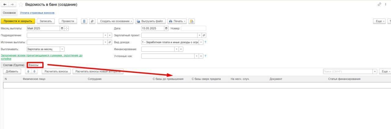 Использовали логику типового функционала и сделали в документе ведомости возможность рассчитать страховые взносы. Также этот механизм расчета был добавлен в обработку «Рабочее место на выплату» (описано выше). В документы ведомостей внесена вкладка, в которой происходит автоматический расчет страховых взносов по аналогии с типовой логикой.