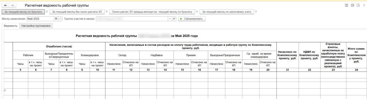 Разработаны выходные формы, где расчетчики собирают затраты на зарплату сотрудников (по часам, видам начислений, НДФЛ, страховым взносам) в разрезе заказов. Эти отчеты можно формировать и по бухгалтерскому, и по налоговому учету. В дальнейшем разработали четыре режима данного отчета.