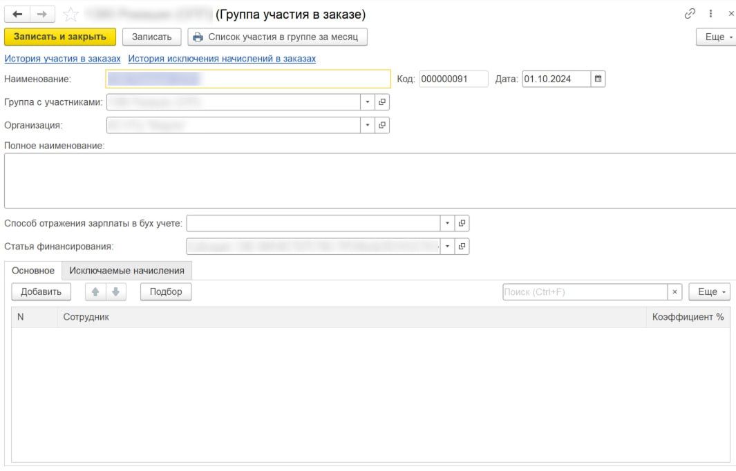 Был разработан справочник «Группы участия». Сотрудники привязываются в системе к заказу. Указывается статья финансирования (используются в качестве заказа) и процент участия каждого человека на проекте. В группе участия добавили возможность указать, какие виды начислений не попадают под распределение по заказам.