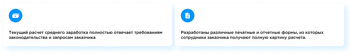 Обеспечили алгоритм сортировки для анализа зарплат сотрудников и сводного отчета. Сделали доработку среднего заработка при работе в командировке в выходные. Сотрудникам более удобно считать отпускные и подготавливать печатные документы. Подробно выводится информация по подразделениям: система собирает и выводит информацию из источников.