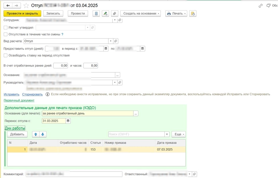 Добавлены для заполнения поля в которые вводится основания для предоставления отгула, за какой день, согласно какой статье, сколько часов. Все данные тянутся автоматически в приказ.