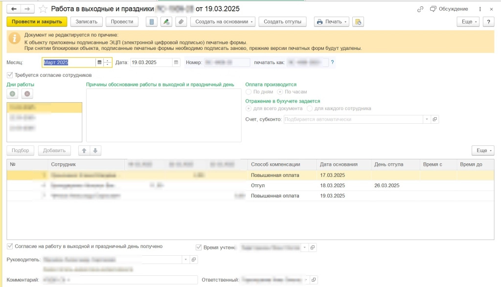 В табличную часть добавлены столбцы "Дата основания", "День отгула", "Время с", "Время до", для тех сотрудников, которые выбрали способ компенсации за отгул. Данные автоматически подставляются в приказ.