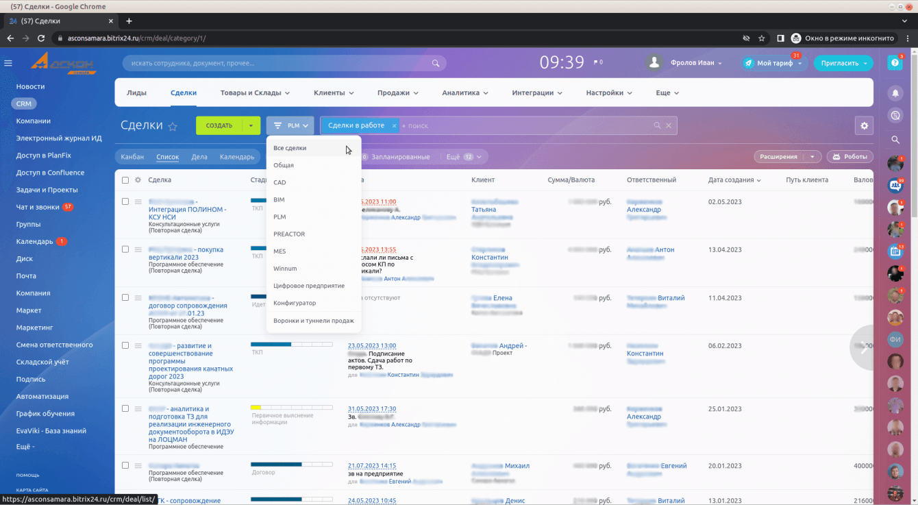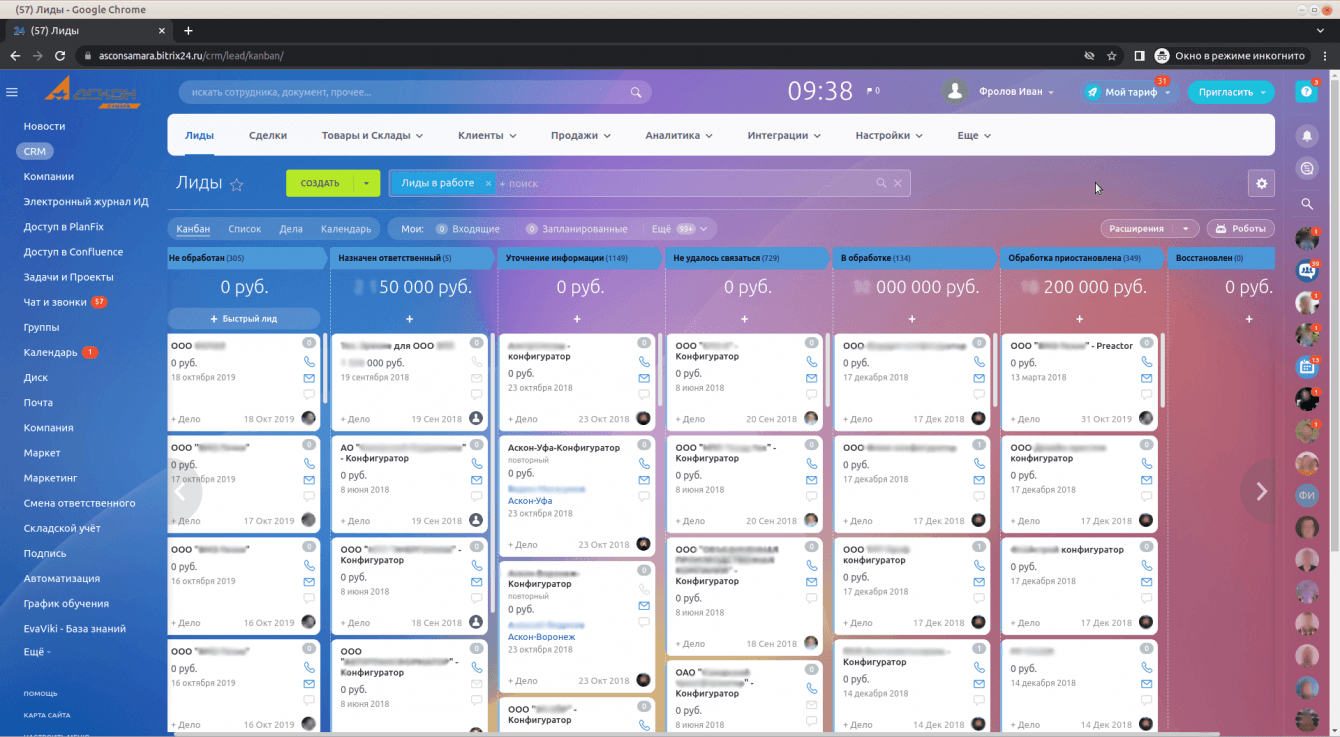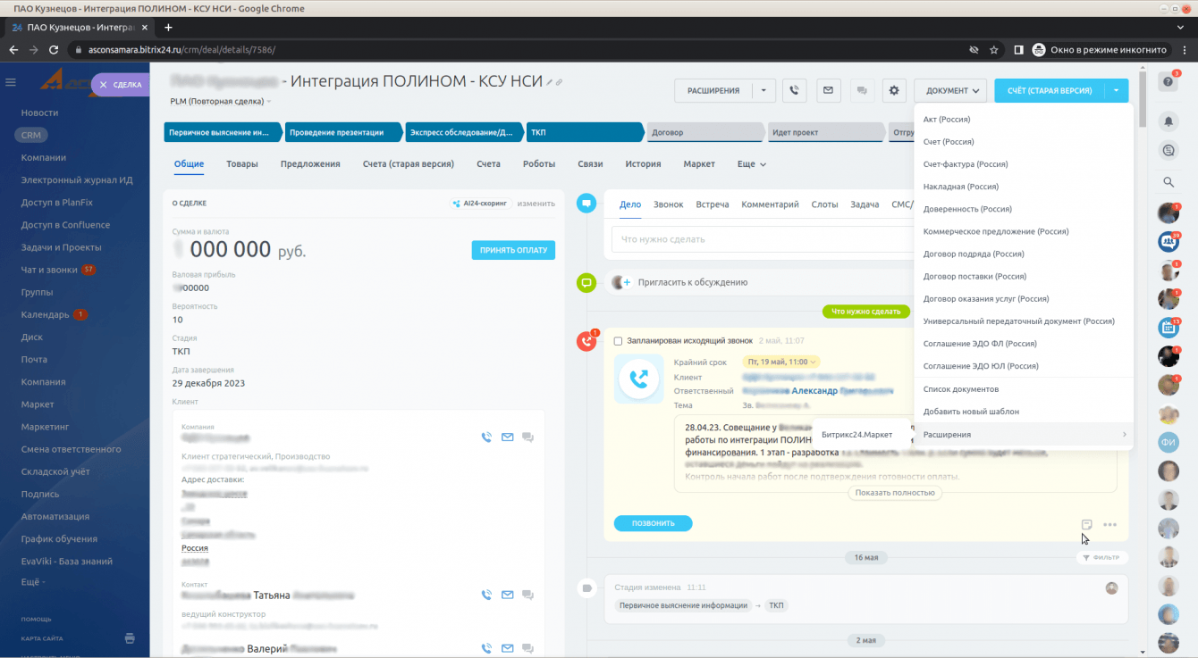 3. Для отдела продаж настроить и внедрить воронки согласно оказываемым услугам компании, настроить печатные формы документов.