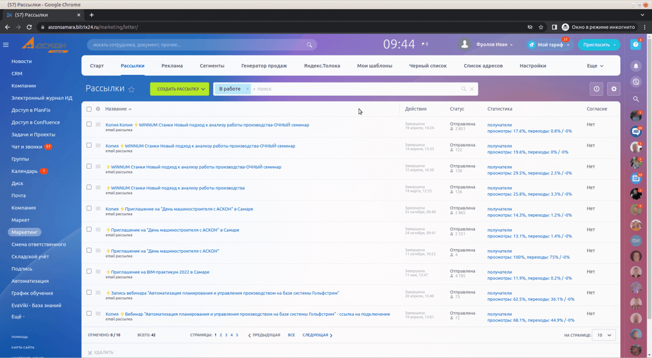 4. Для отдела маркетинга настроить рассылки, провести обучение для дальнейшей самостоятельной работы.