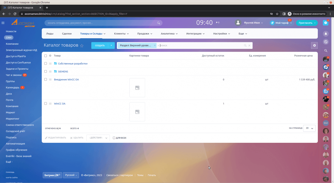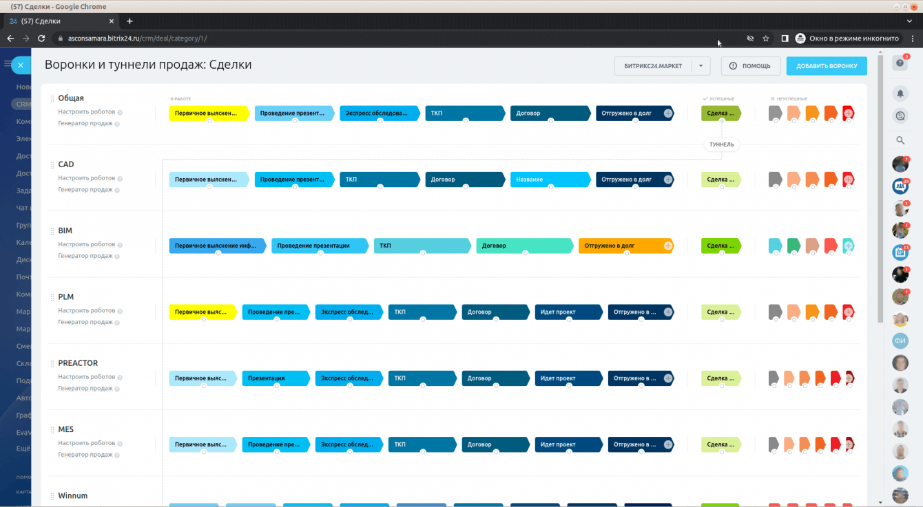 2. В CRM настроены воронки продаж по направлениям деятельности компании, создан каталог товаров/услуг, настроены печатные формы документов.