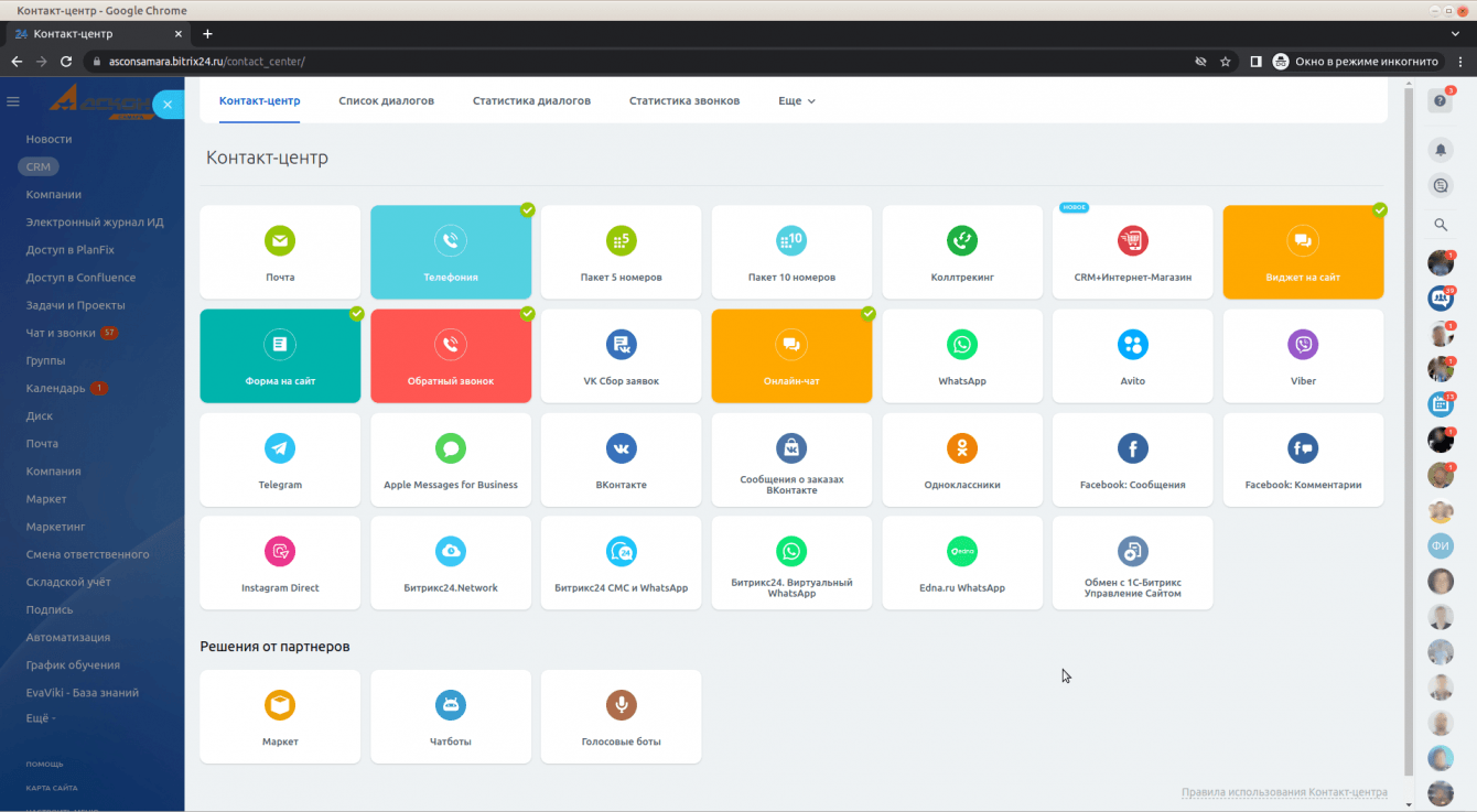 4. В Контакт-центре настроены основные каналы получения лидов.