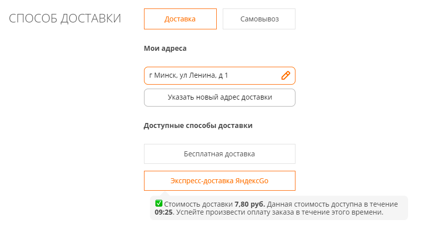 4. После подтверждения возможности доставки на этапе оформления заказа в системе Яндекс Доставка происходит предварительное бронирование, и клиенту предоставляется время для оплаты заказа онлайн.