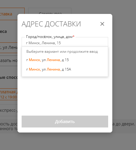 Чтобы избежать ошибок при вводе адреса на этапе оформления заказа, мы интегрировали API стороннего сервиса DaData. Теперь, когда пользователь вводит адрес доставки на сайте, DaData автоматически предлагает корректные варианты из существующих адресов, и пользователю остается лишь выбрать нужный:
