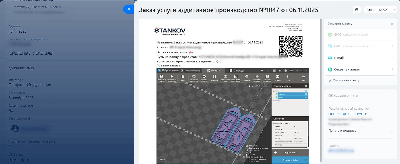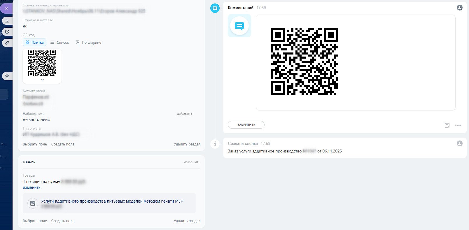 Для каждой сделки автоматически создаётся уникальный QR-код, который связывает заказ с CRM и документами.