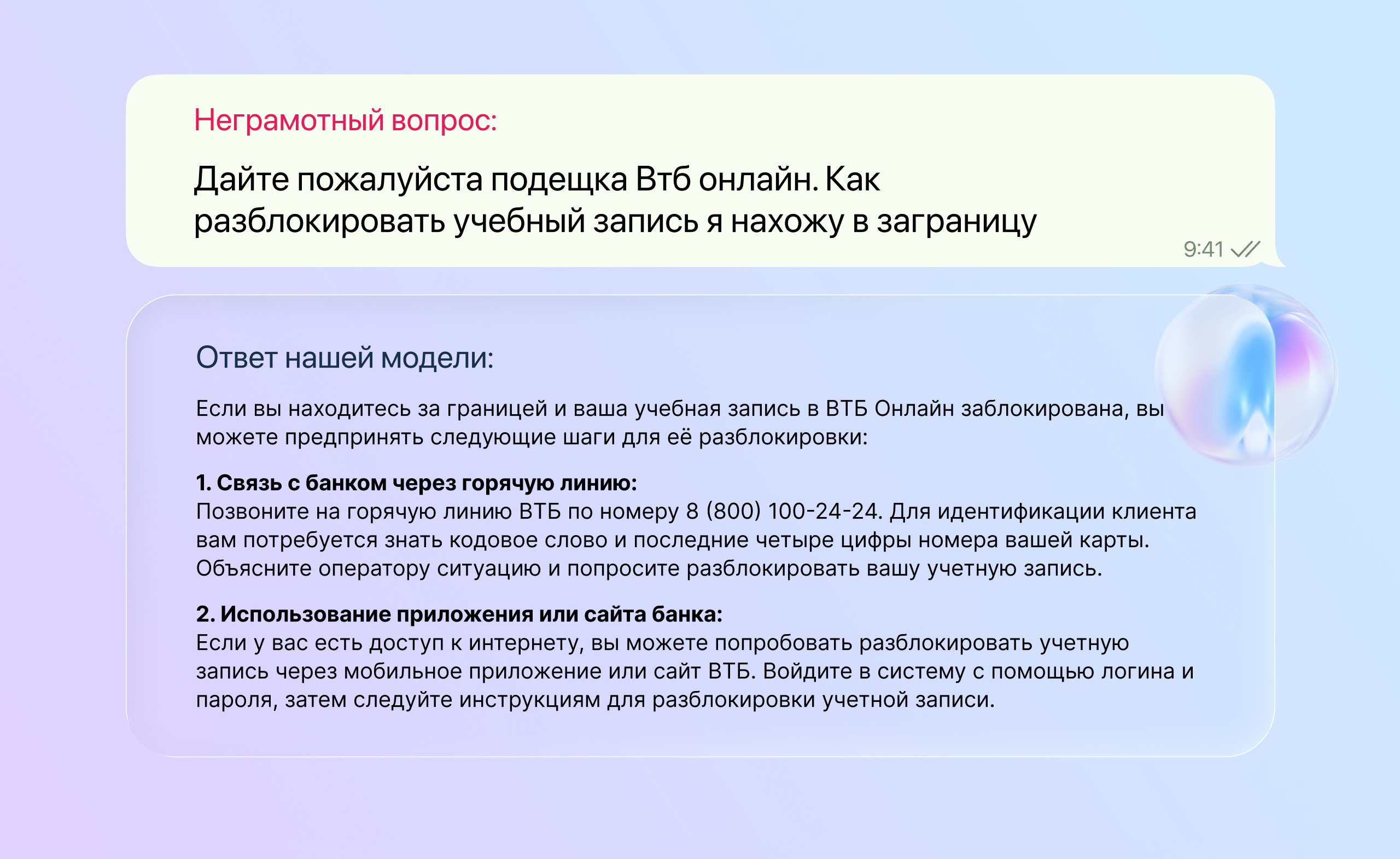 Результат: система стала отвечать исключительно на вопросы, касающиеся финансовых тем, в итоге точность ответа достигла 98%.