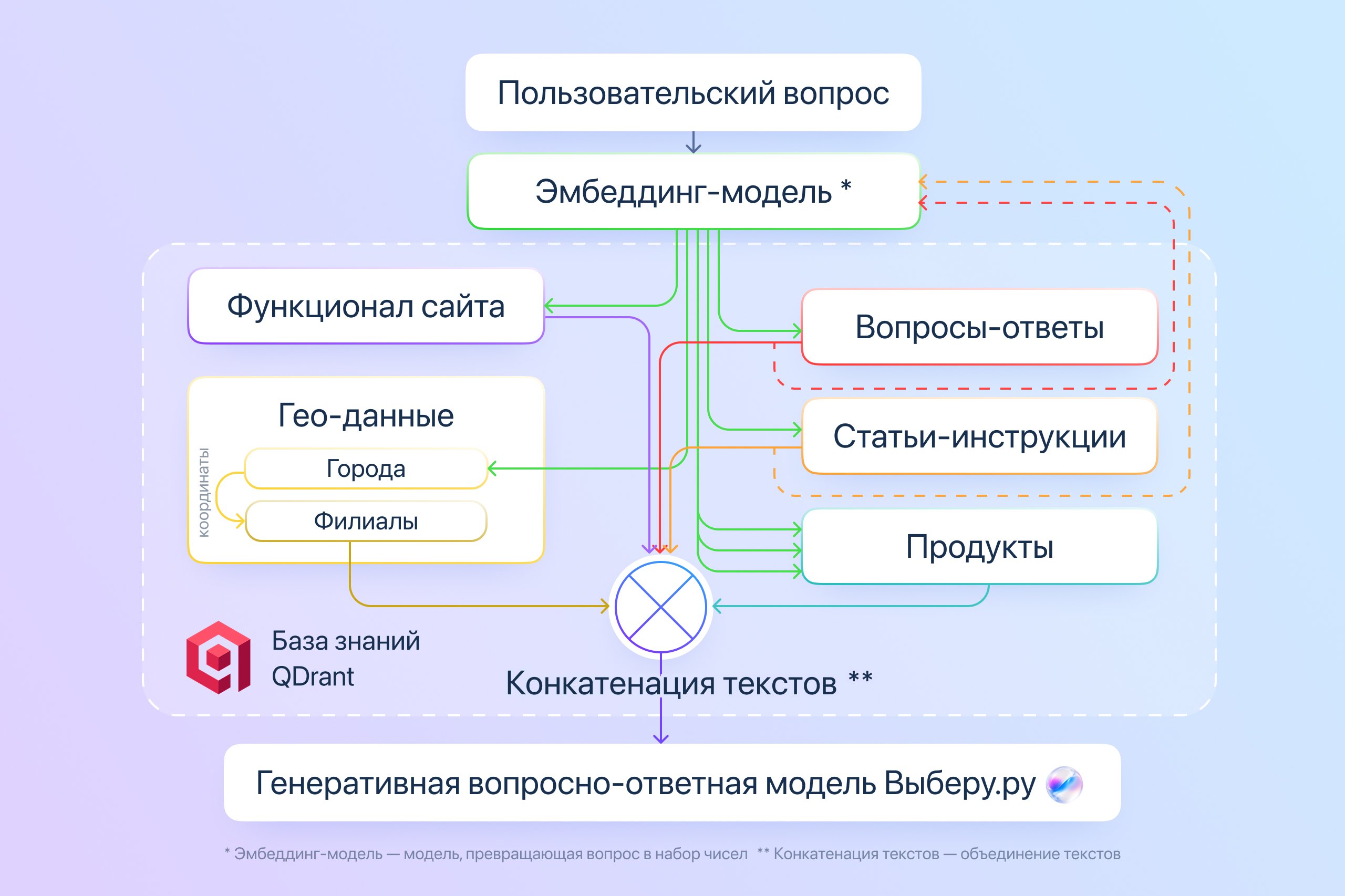 Так как пользователь, опираясь на наши ответы, принимает финансовые решения, нам было важно, чтобы модель не придумывала ответы и давала точную информацию. Чтобы избежать «додумывания» мы подключили базу знаний, состоящую из статей с сайта, инструкций и ответов экспертов. Теперь модель сначала ищет нужную информацию, а потом формирует ответ на ее основе.