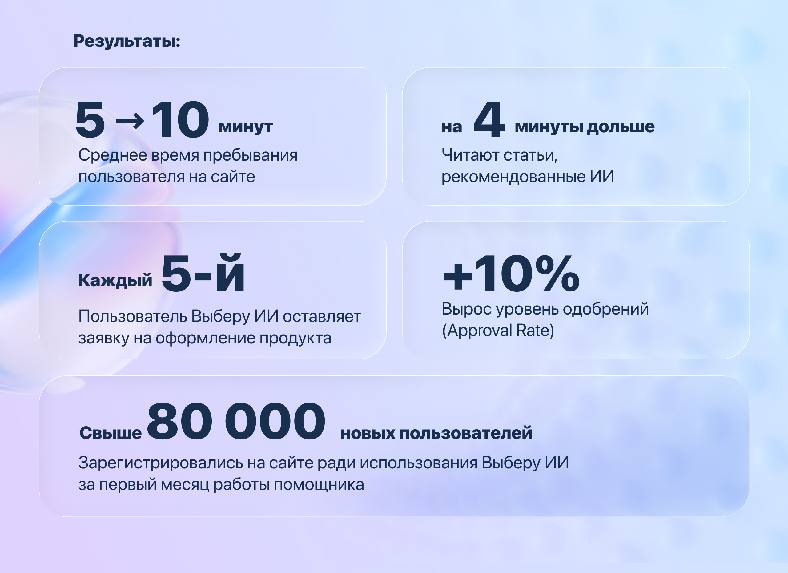 + за счет помощи ИИ-помощника, пользователи стали лучше понимать куда и за каким продуктом обратиться и уровень одобрений (Approval Rate) вырос на вырос на 10%;