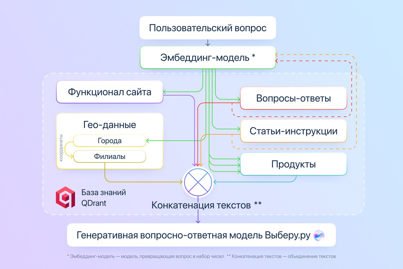 Создание Выберу ИИ — итог глубокого анализа пользовательского поведения на платформе Выберу.ру. По результатам нашего исследования, 59% респондентов выразили готовность обращаться за консультацией к искусственному интеллекту вместо человека, а 44% предпочли бы полностью доверить выбор финансовых продуктов нейросети. Пользователи ищут быстрые, точные и понятные ответы — без сложных формулировок и бюрократических терминов. Именно поэтому мы разработали модель, которая учитывает специфику российского финансового рынка, понимает повседневные запросы и может уверенно работать как с типовыми вопросами, так и с актуальными, быстро меняющимися темами — от изменений в законодательстве до новых условий льготных программ.