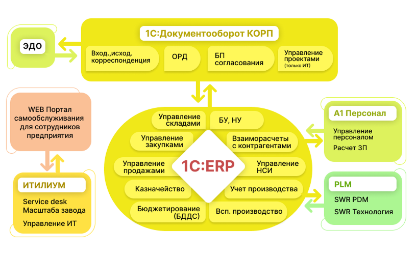 В результате проведенного аудита принято решение о модернизации существующей системы управления до уровня современной системы на базе «1С:ERP Управление предприятием». Кроме того, вокруг «1С:ERP» внедрялись поддерживающие системы: