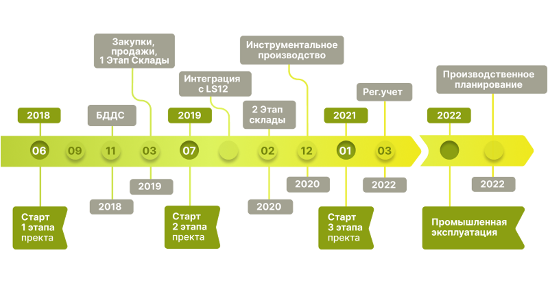 С учетом масштабов производства и сложности внутренних процессов внедрение «1С:ERP» было разбито на несколько этапов.