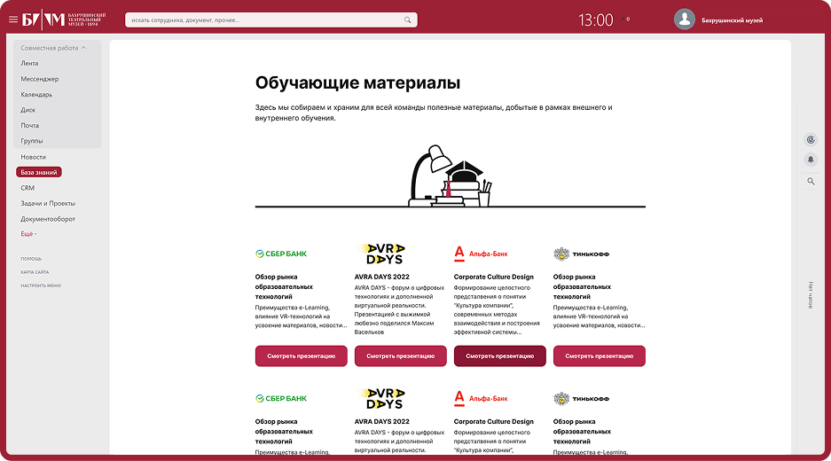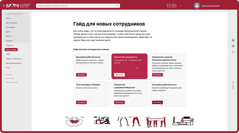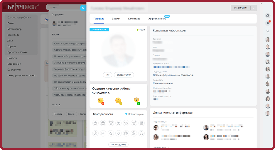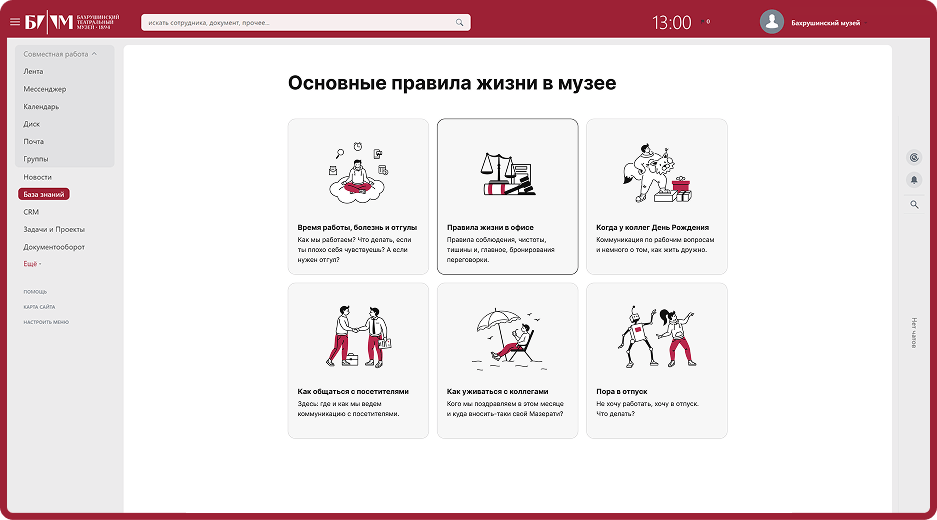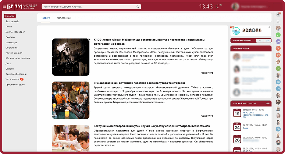 Теперь сотрудники Бахрушинского театрального музея работают в едином информационном пространстве, что существенно повысило эффективность внутренних процессов. Время на выполнение задач сократилось на 35%, а вовлеченность сотрудников увеличилась на половину.