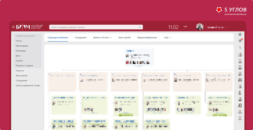 Портал Битрикс24 позволил отразить сложную внутреннюю структуру музея, включая все подразделения, отделы и сотрудников. Это не только упорядочило рабочий процесс, но и упростило взаимодействие между отделами, сделав работу музея более прозрачной и эффективной.