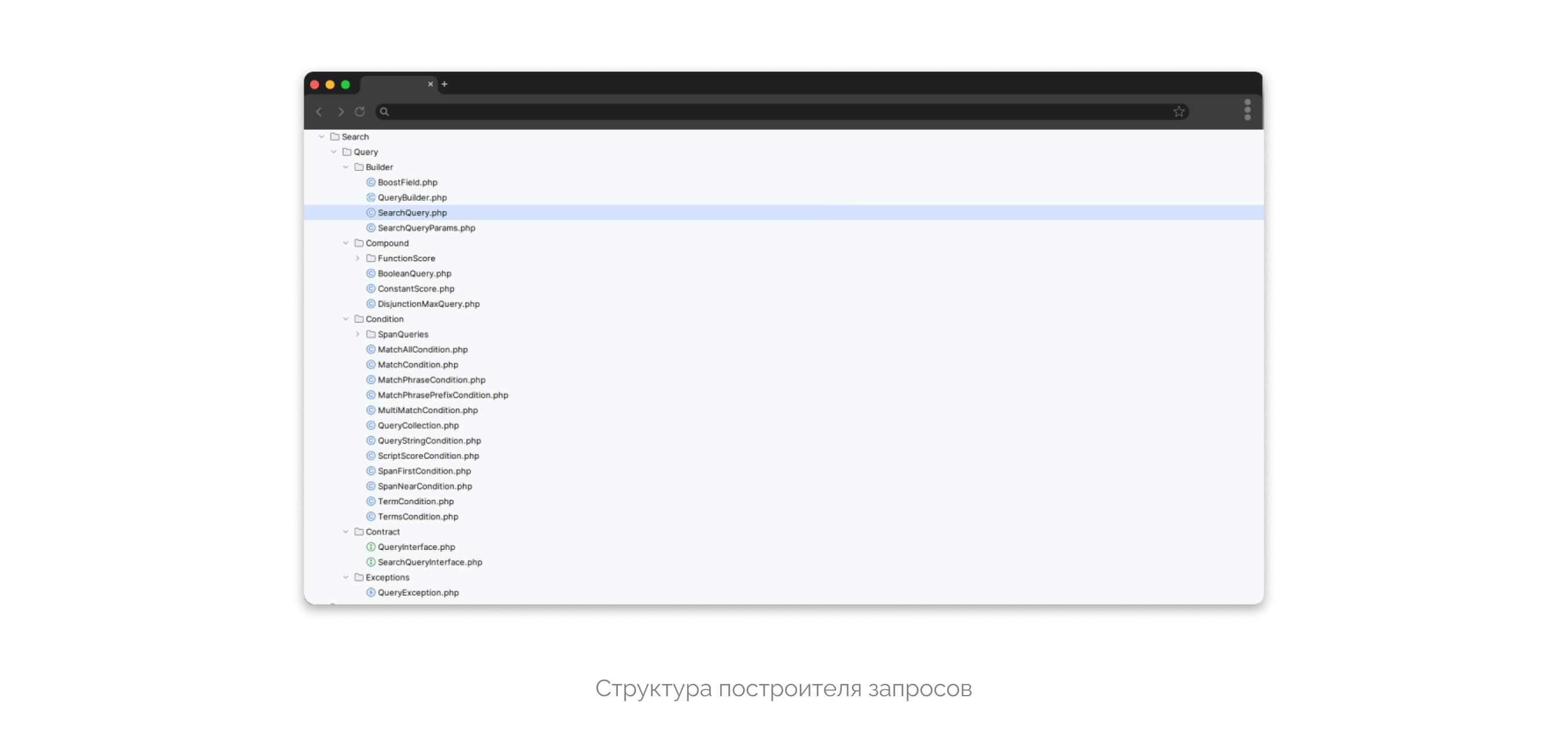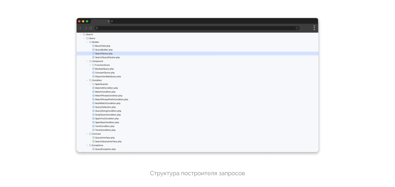 Во-вторых, за релевантность должен отвечать только поисковый движок. В коде не должно быть дополнительных вычислений – раньше мы здесь дополнительно рассчитывали веса. Для этого потребовалось реализовать объектно-ориентированный построитель запросов, передающий их в Elasticsearch в виде JSON-объектов, что позволяет работать с поисковой системой как с базой данных. В такую архитектуру легче вносить изменения и поддерживать её.