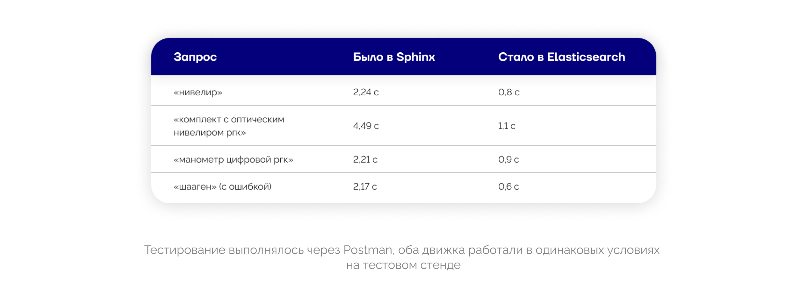На переезд с Sphinx на Elasticsearch ушло четыре месяца (с сентября по декабрь 2024 года). В результате поиск по 30 000 товаров в 2 000 разделов ускорился в среднем в 3 раза. Раньше на обработку поискового запроса уходило 2-4 секунды, теперь – в пределах секунды.