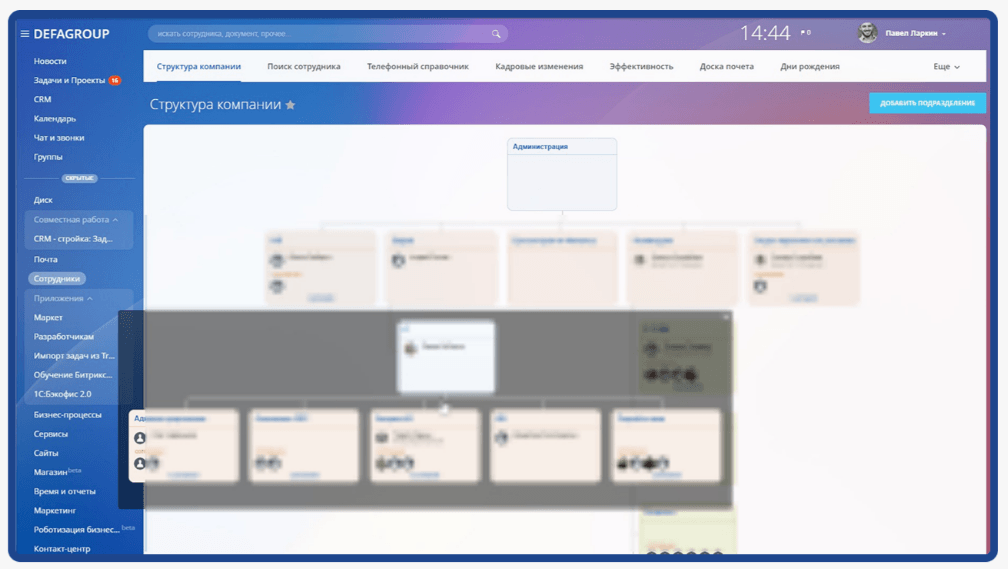 Штатный функционал построения организационной структуры компании помог ускорить общение между отделами и сотрудниками.