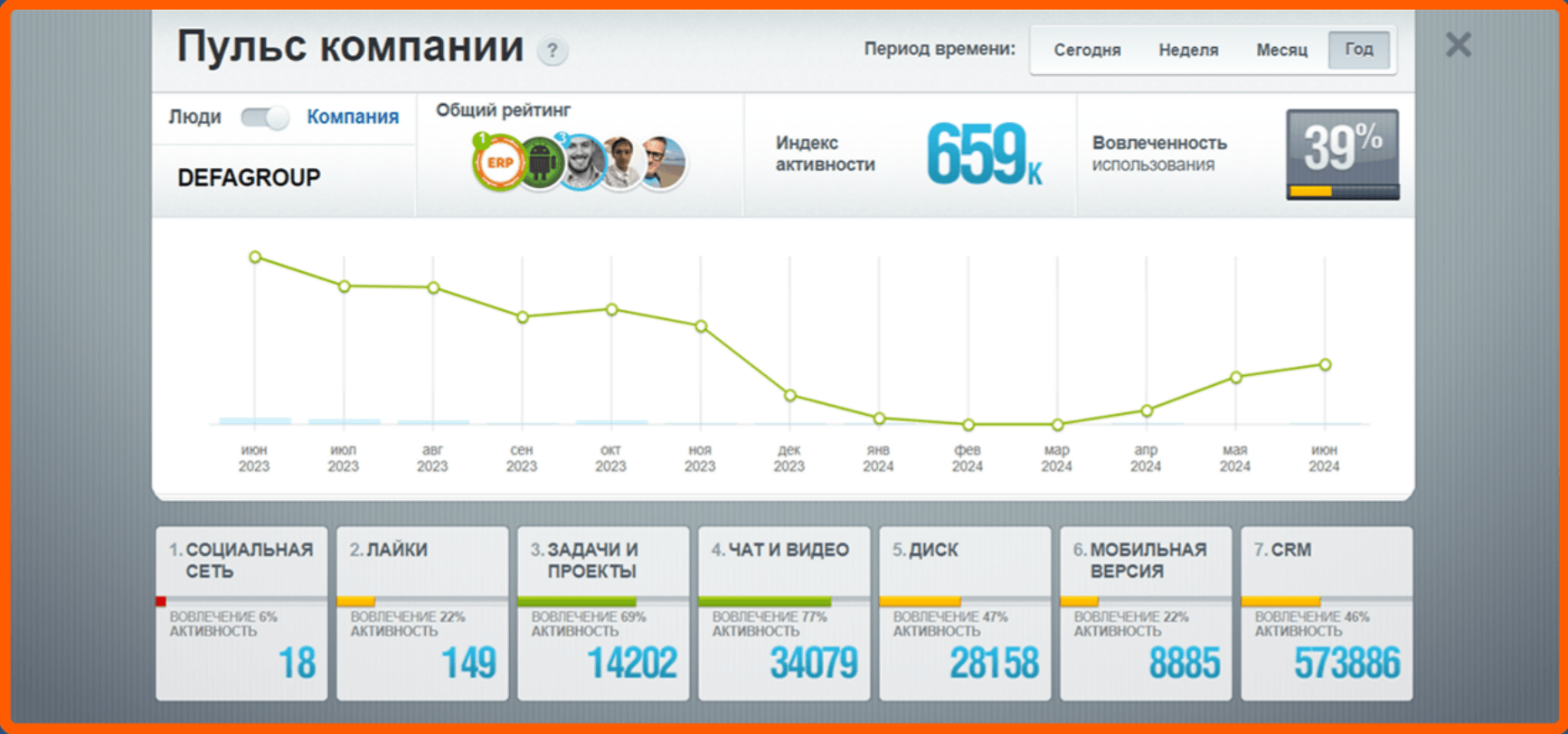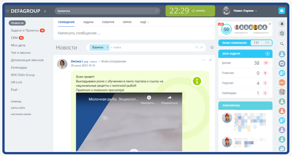 Больше 50 сотрудников сейчас активно пользуются порталом: пишут в живую ленту, публикуют новости, ведут обсуждения, работают в CRM-системе, а Пульс компании помогает отслеживать активность и вовлеченность каждого сотрудника.