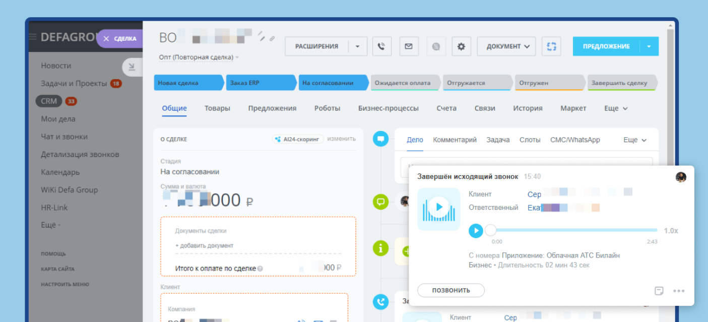 Теперь сотрудникам не нужно переключаться между разными мессенджерами, искать нужные переписки, вспоминать номера телефонов и содержание разговоров. Стало проще управлять сделками, отслеживать путь клиента и хранить документы.