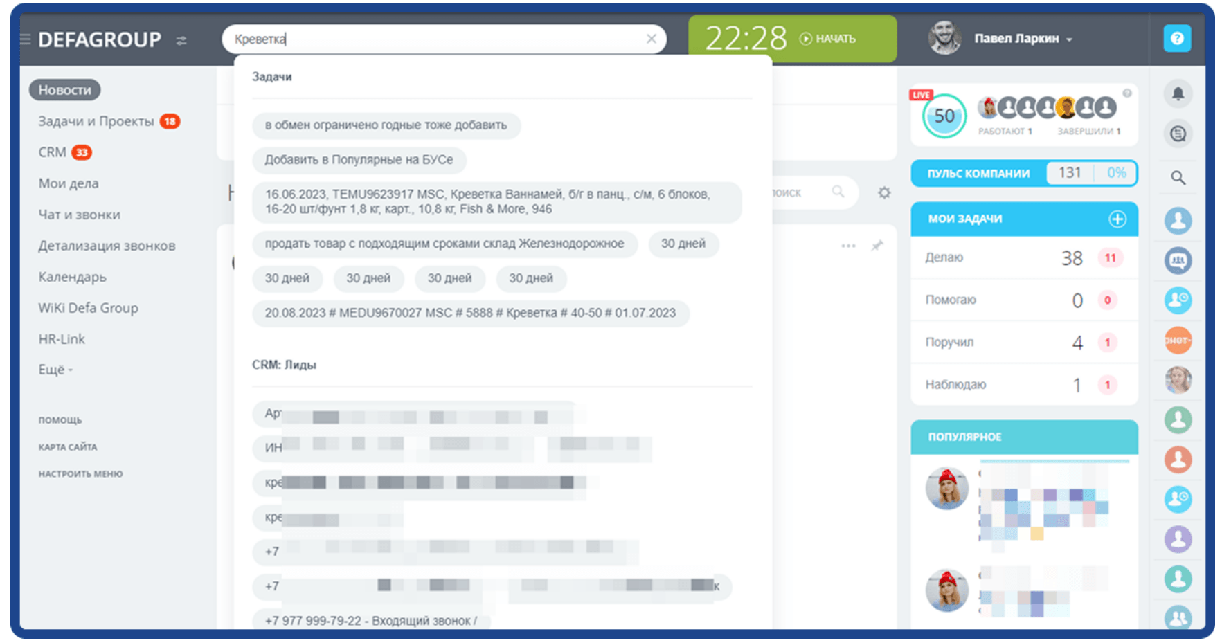 Единый поиск, который ищет информацию сразу по всем разделам портала: сотрудникам, задачам, CRM, документам, чатам и т.д.