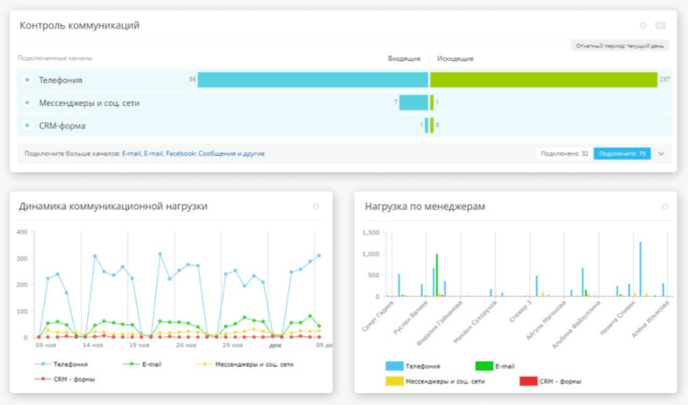 Отчёты по CRM-системе выводятся в разделе Dashboard, где сразу виден вклад менеджеров в продажи, нагрузка на менеджеров в разрезе каналов коммуникации, а также менеджеров, за которыми руководителю нужно присматривать.