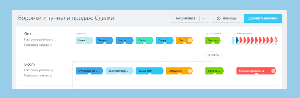 Мы создали индивидуальные воронки продаж по каждому направлению. Они показывают распределение сделок по стадиям — это позволяет менеджерам быстрее реагировать на заявки и не упускать ни одного клиента.