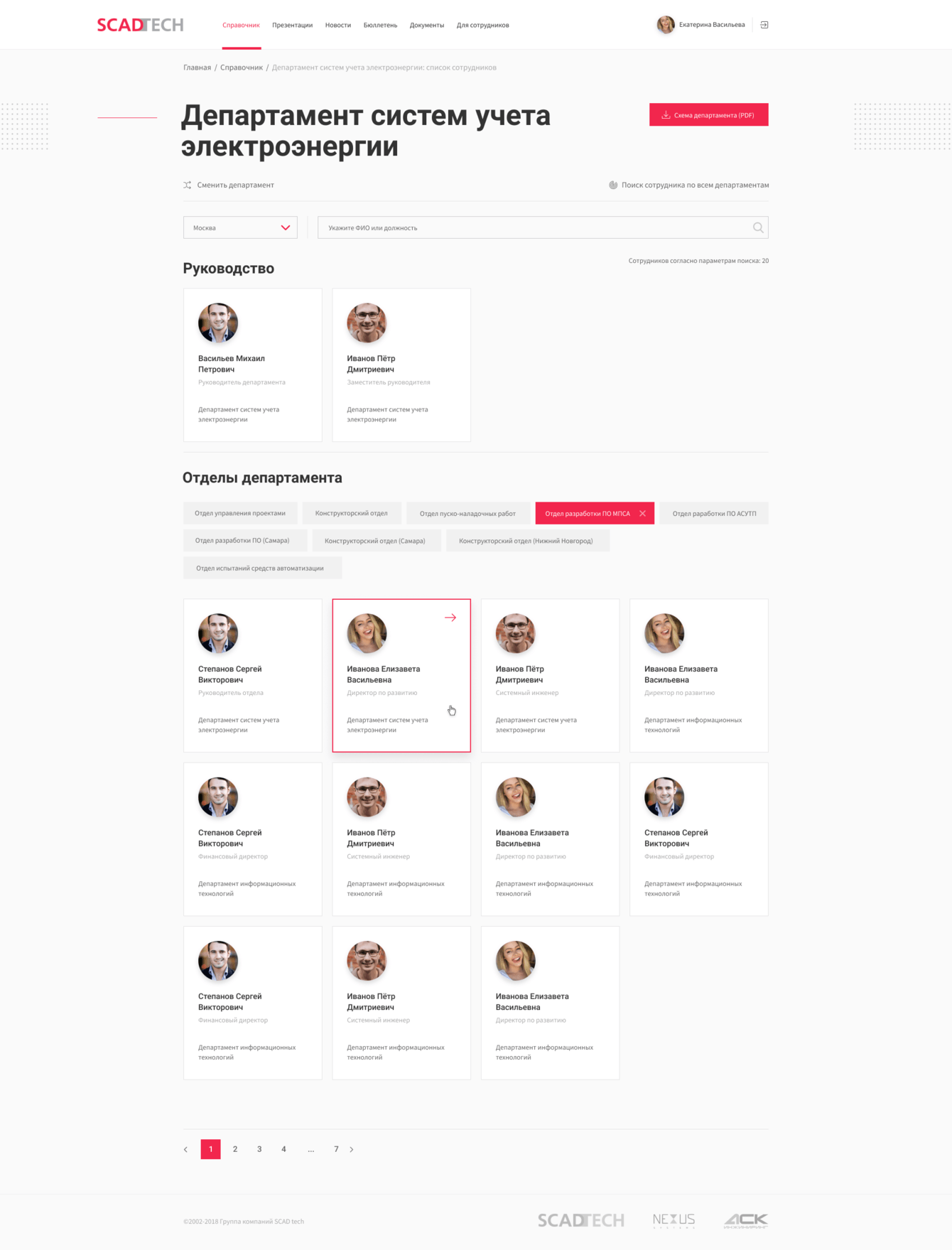 У «СКАД тех» интересная и объемная внутренняя структура. Множество подразделений в разных городах России, департаменты и «обслуживающие» их бизнес-единицы со своими отделами. При проектировании мы постарались отобразить эту структуру удобно и понятно для сотрудников.