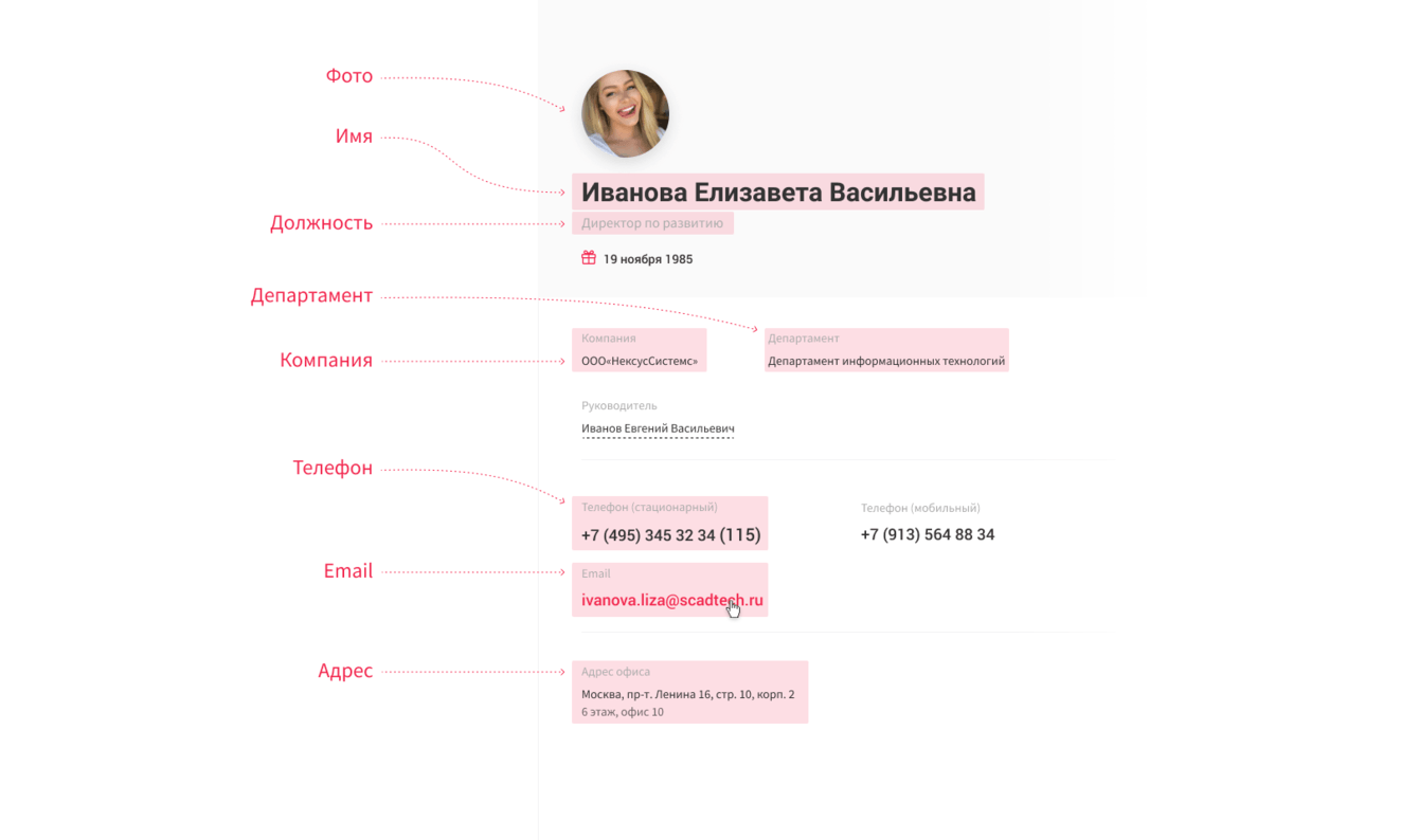 Одна из самых важных задач внутреннего портала — размещение информации о сотрудниках. Нам необходимо было сделать карточки для каждого из 1100+ работников компании, сформировать верное отображение структуры и иерархии департаментов и отделов.