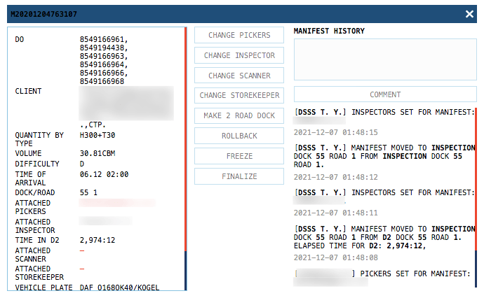 Внутри самого манифеста ведется лог передвижения и таймаутов. Есть возможность сменить специалиста при наличии свободных, прокомментировать отгрузку. При необходимости можно манифест вернуть на шаг назад или заморозить его. Просроченный манифест на какой-либо стадии также как и новый обозначается мигающим индикатором.