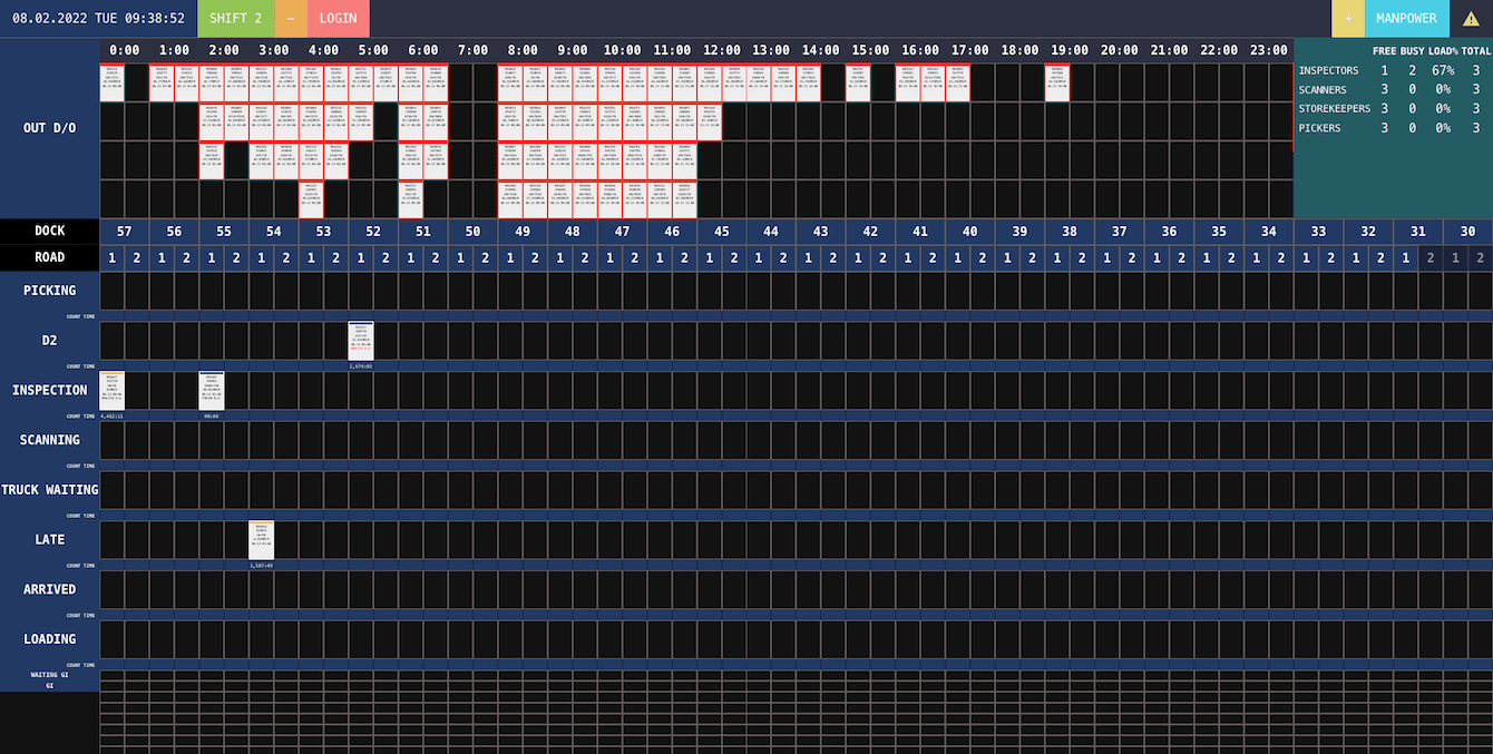 Отгрузки (далее манифесты) импортируются в систему из xls файла. Новые манифесты выводятся по времени, имеют мигающий индикатор. Манифесту присваивается свой уникальный номер. Манифест содержит информацию о клиенте, количестве, объему груза, времени ожидания грузовика, ФИО водителя и данных ТС, типе заказа по сложности.