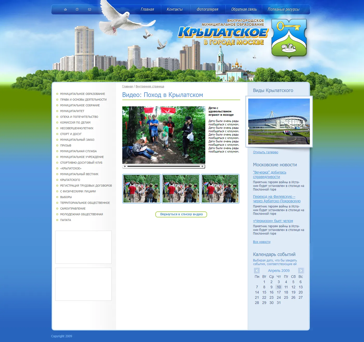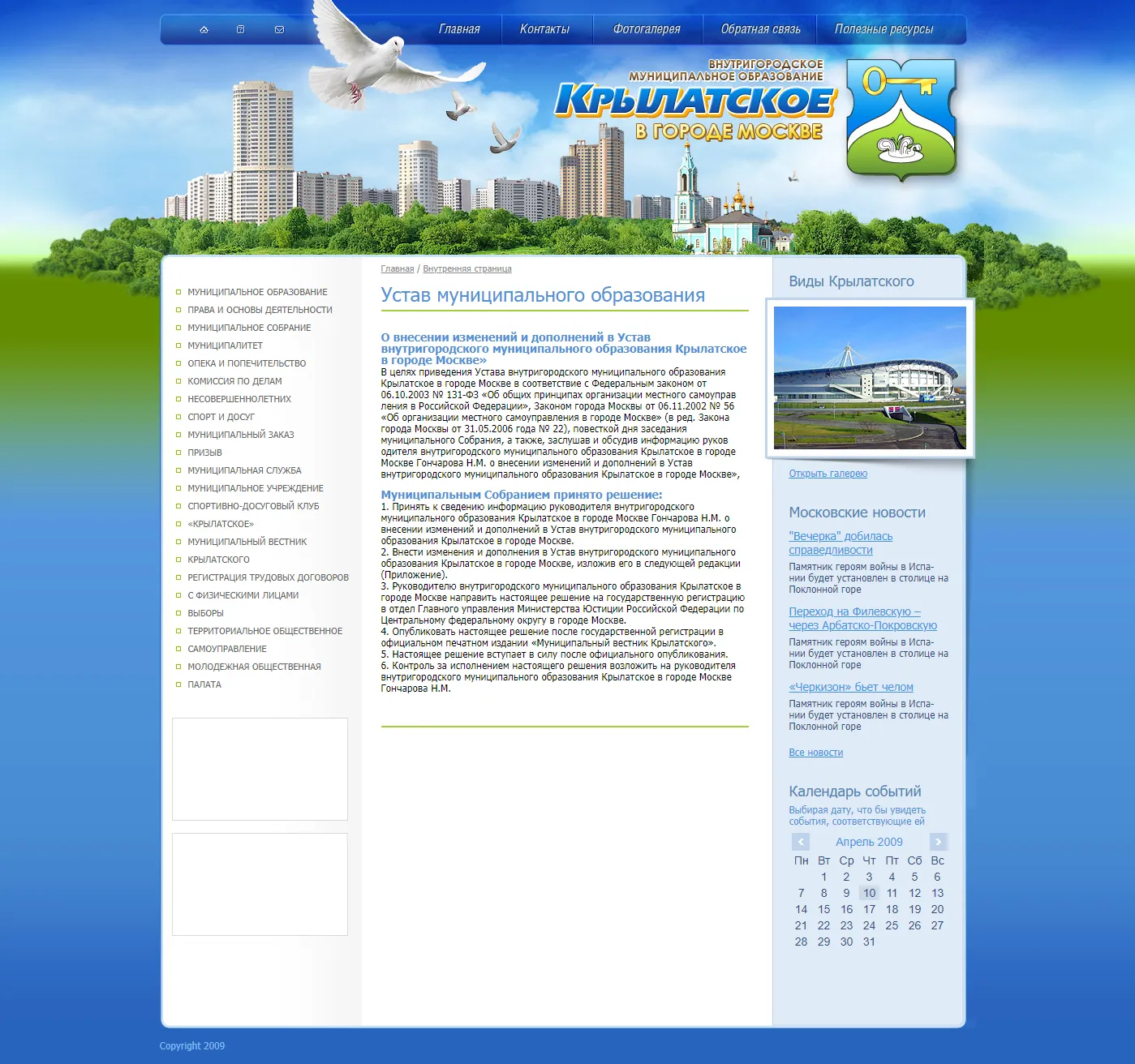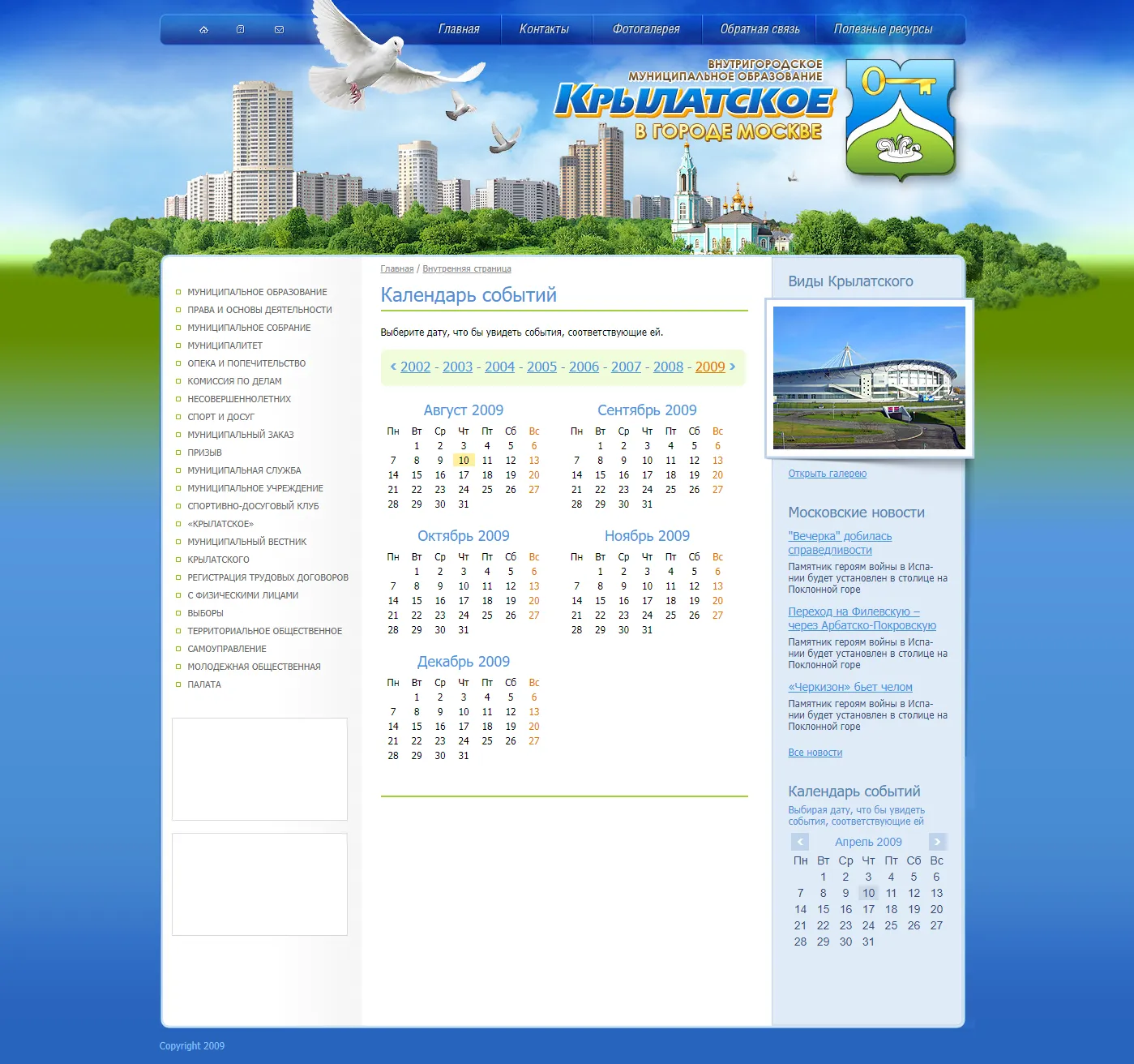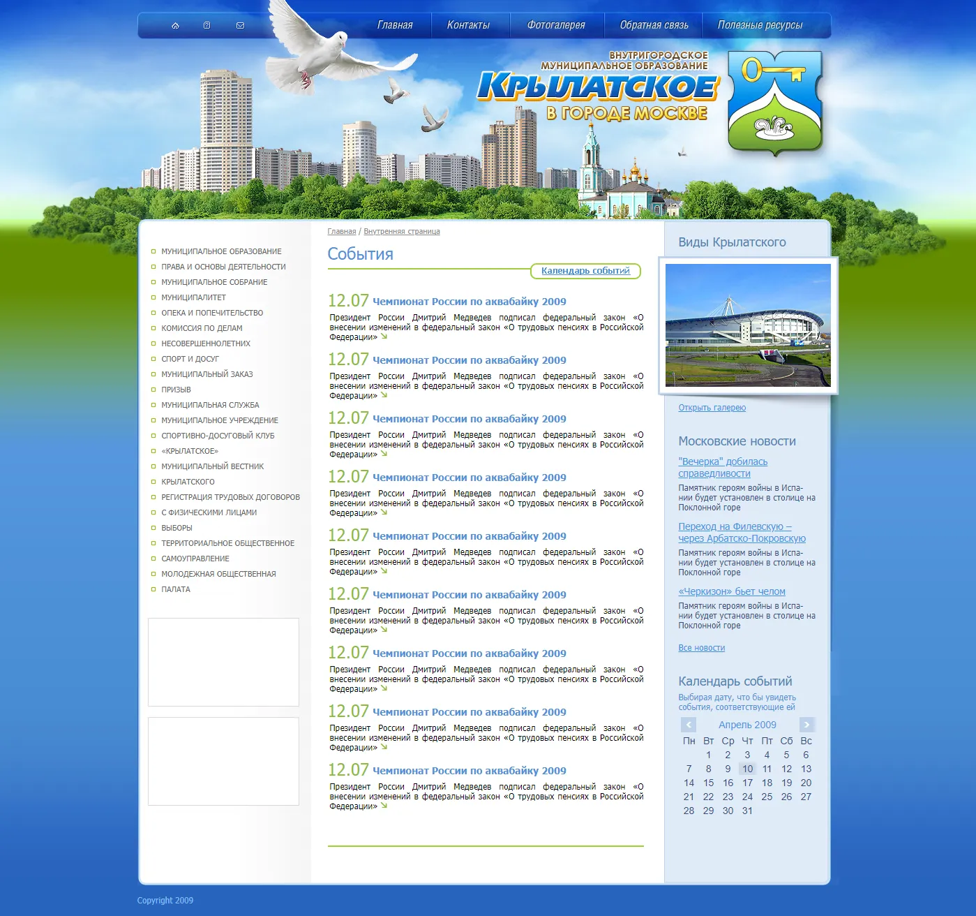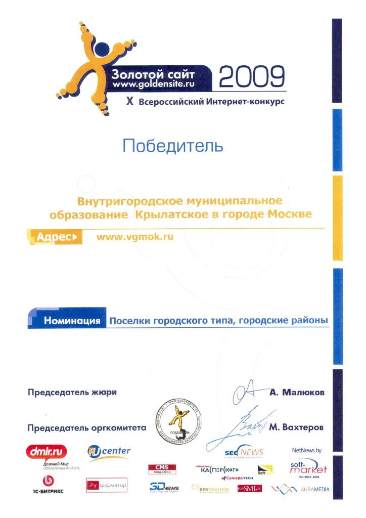 После завершения разработки и запуска проект был представлен на всероссийском интернет-конкурсе «Золотой сайт 2009». Сайт муниципального образования Крылатское принял участие в конкурсной программе в номинации, связанной с городскими районами и муниципальными образованиями. По итогам рассмотрения проект был признан победителем в своей категории. Это стало дополнительным подтверждением того, что в рамках проекта удалось создать не просто рабочий официальный ресурс, а качественный сайт с продуманной структурой, достойным визуальным уровнем и сильной реализацией.