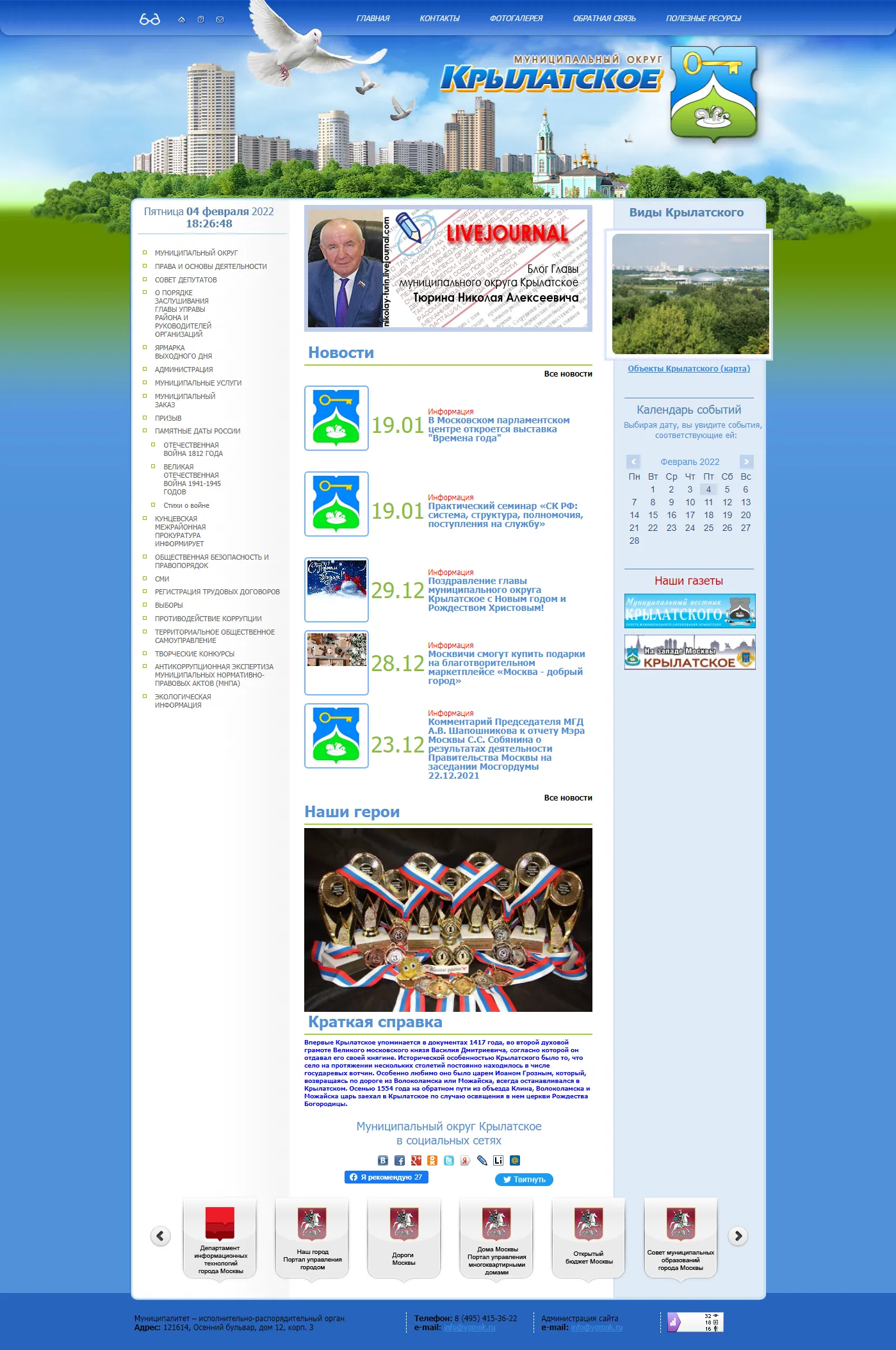 Разработать официальный сайт муниципального образования Крылатское как современный, понятный и удобный информационный ресурс для жителей и посетителей. Требовалось создать сайт с аккуратной структурой, удобной навигацией и возможностью оперативно публиковать новости, документы, официальные материалы и другую важную информацию. При этом ресурс должен был соответствовать статусу муниципального сайта, вызывать доверие, быть простым в использовании и удобным в дальнейшей поддержке.