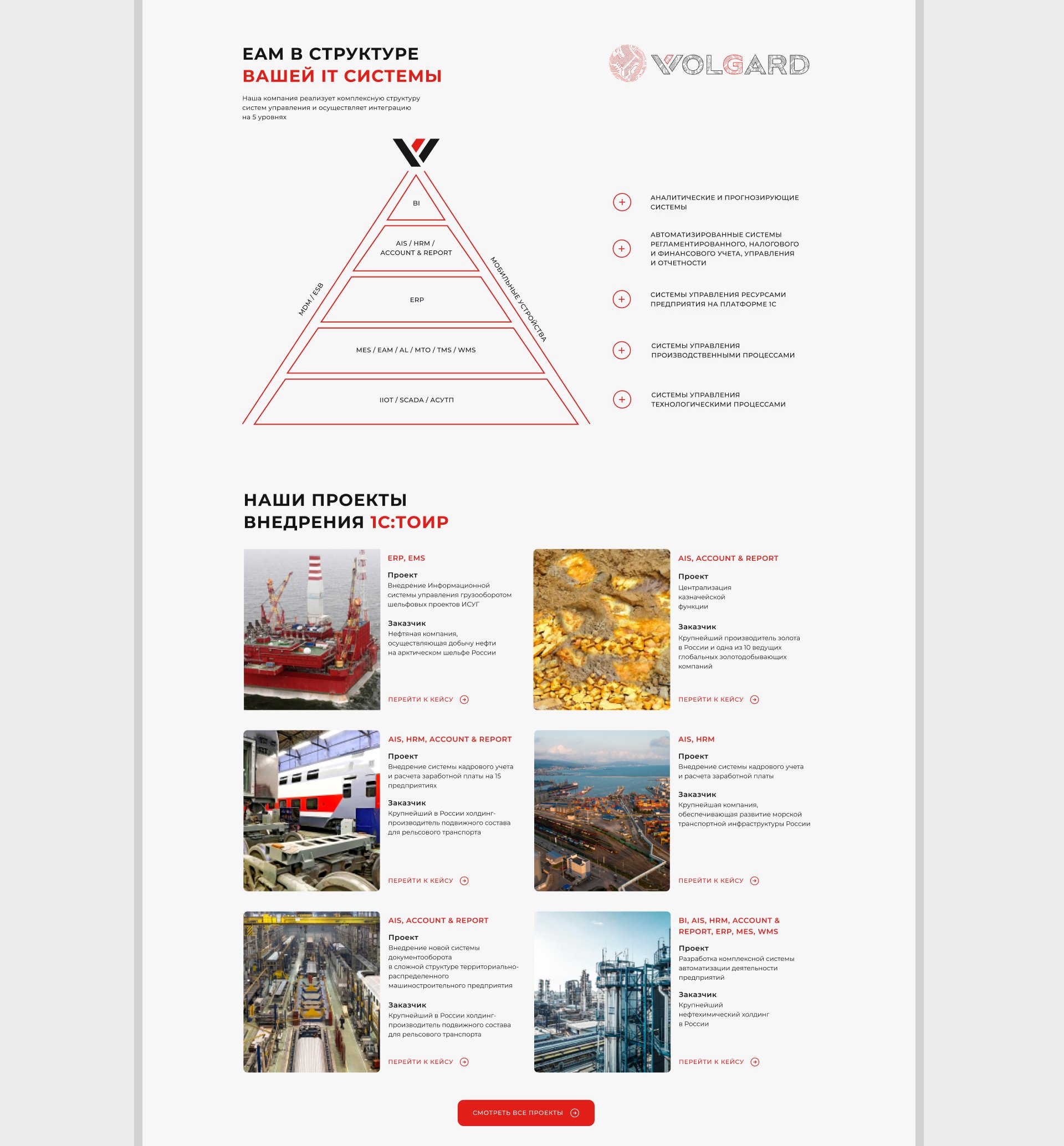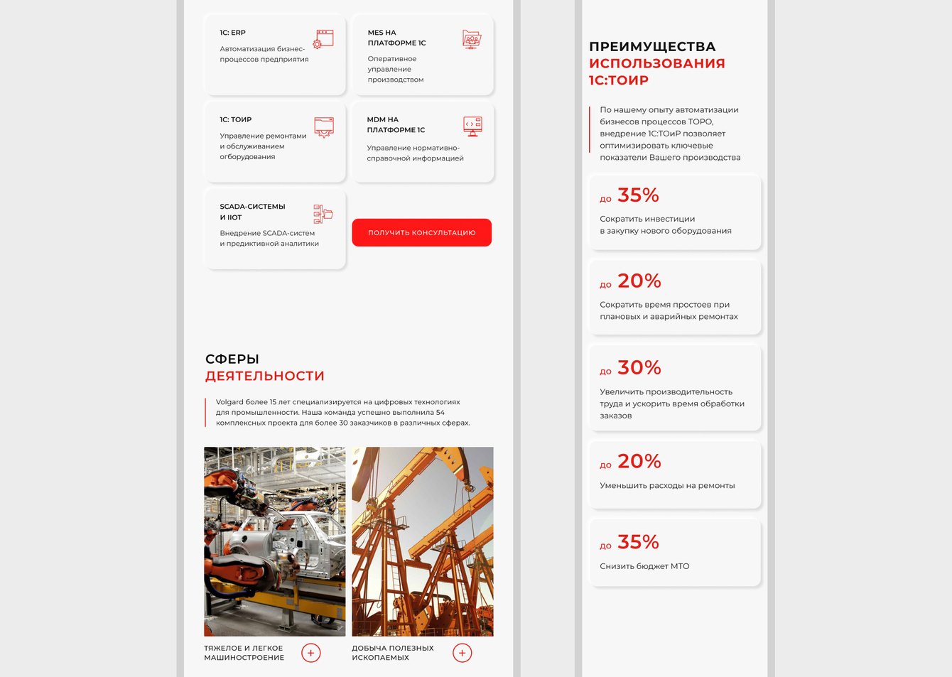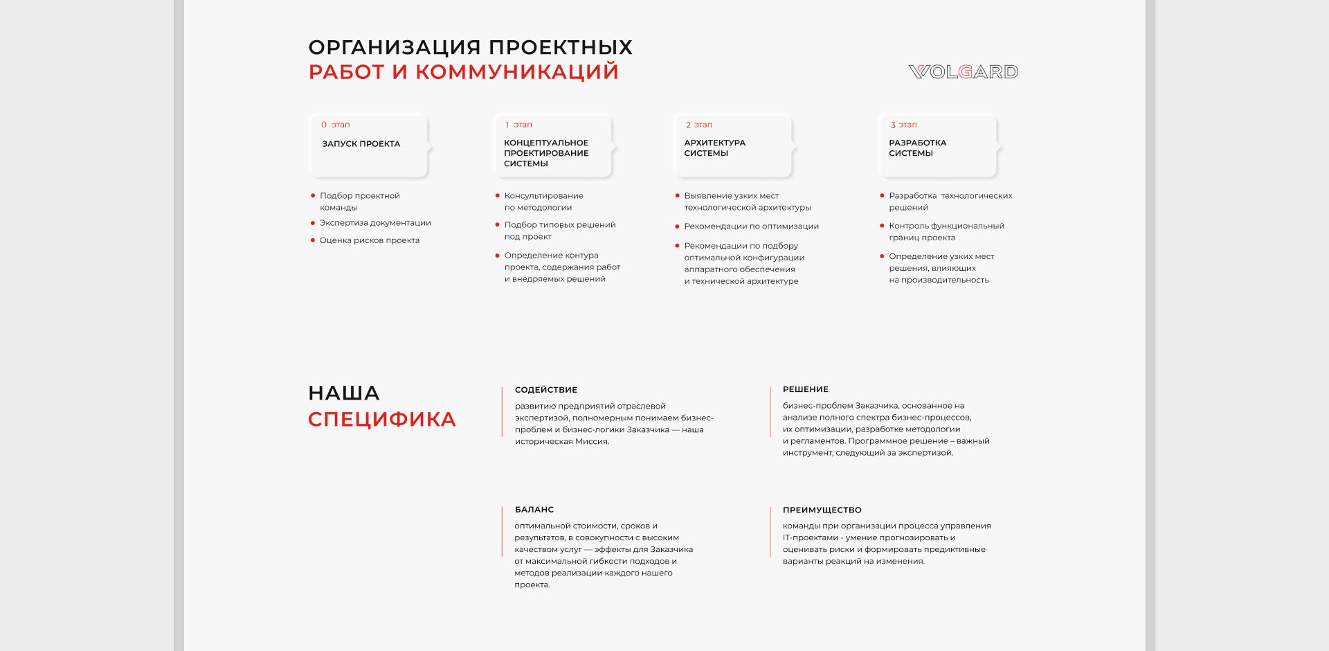 1. Сбор и анализ исходных данных: - Детальное изучение деятельности компании Волгард, особенностей её продуктов и предоставляемых услуг (решений IIoT, ERP, TOиР, MES). - Определение ключевых целей сайта: ознакомление потенциальных клиентов с технологиями и возможностями интеграции IT-решений в производственные процессы.2. Формулировка требований и постановка задач: - Выявление основных функциональных блоков и структуры будущих страниц сайта. - Формализация технического задания, согласование его с заказчиком.3. Разработка концепции дизайна: - Подготовка дизайн-макетов главной страницы, внутренних страниц с описанием продуктов и контактной информацией. - Создание прототипов и wireframes, визуализации элементов интерфейса и адаптация макета под различные устройства.4. Подготовка материалов: - Сбор и структурирование контента (текстов, иллюстраций, логотипов, схем, фотографий оборудования). - Согласование с клиентом финального варианта контент-плана и графика работ.
