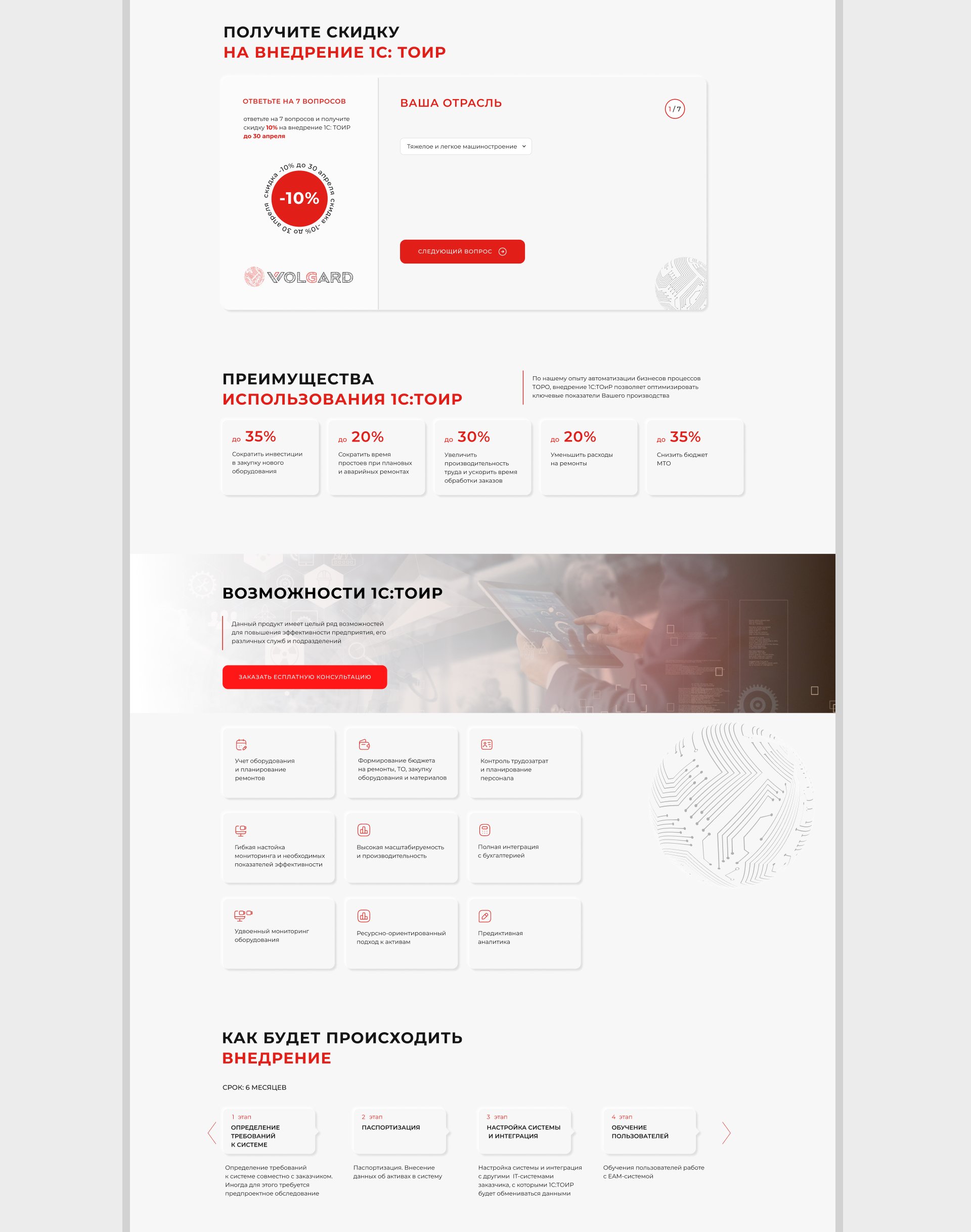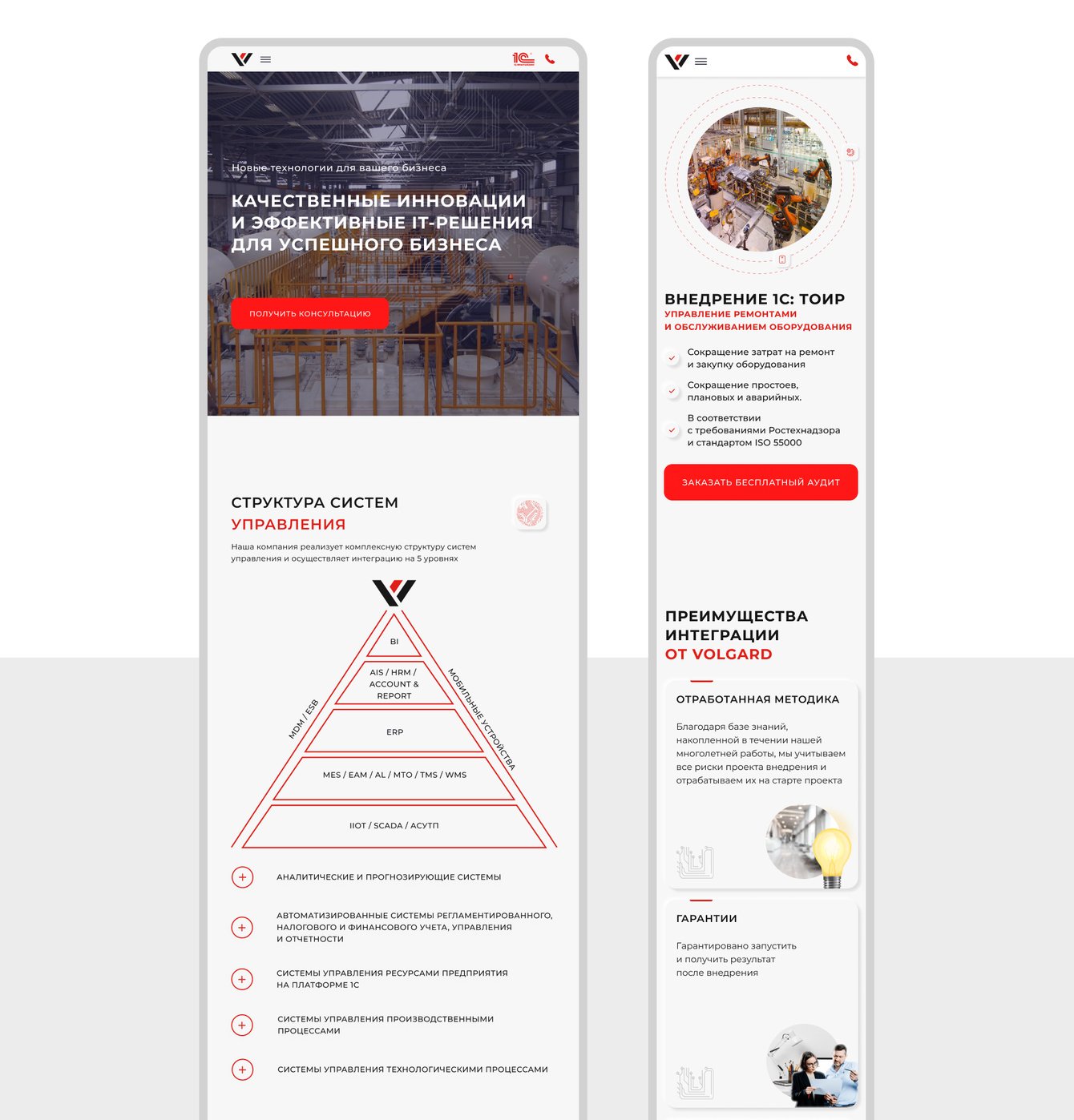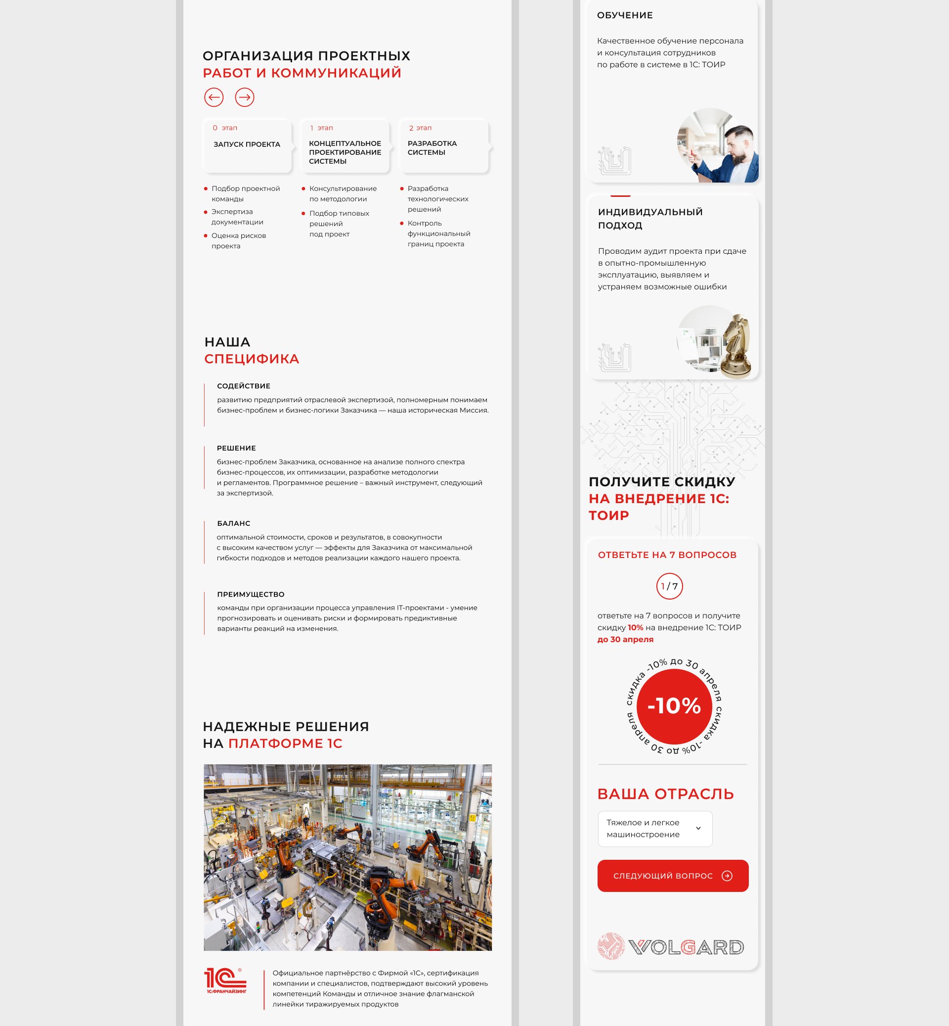 1. Сбор и анализ исходных данных: - Детальное изучение деятельности компании Волгард, особенностей её продуктов и предоставляемых услуг (решений IIoT, ERP, TOиР, MES). - Определение ключевых целей сайта: ознакомление потенциальных клиентов с технологиями и возможностями интеграции IT-решений в производственные процессы.2. Формулировка требований и постановка задач: - Выявление основных функциональных блоков и структуры будущих страниц сайта. - Формализация технического задания, согласование его с заказчиком.3. Разработка концепции дизайна: - Подготовка дизайн-макетов главной страницы, внутренних страниц с описанием продуктов и контактной информацией. - Создание прототипов и wireframes, визуализации элементов интерфейса и адаптация макета под различные устройства.4. Подготовка материалов: - Сбор и структурирование контента (текстов, иллюстраций, логотипов, схем, фотографий оборудования). - Согласование с клиентом финального варианта контент-плана и графика работ.