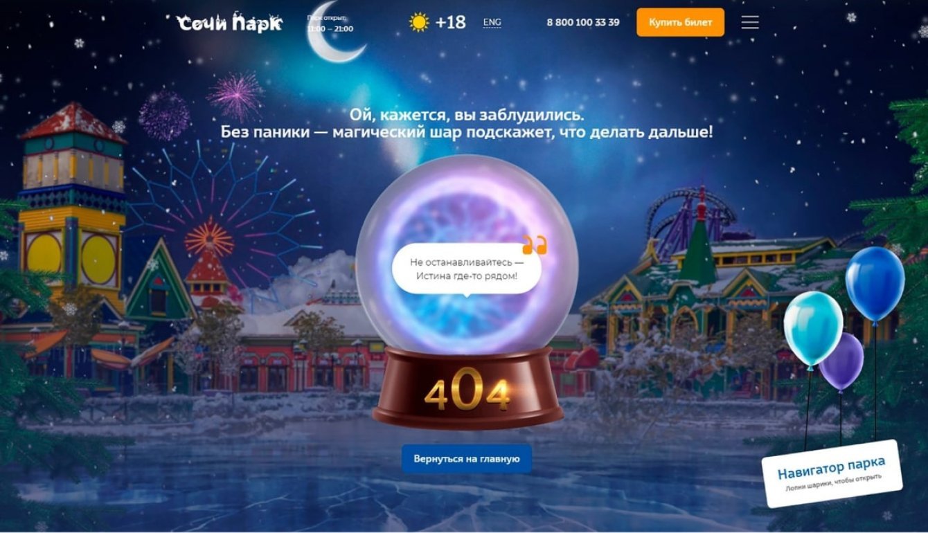 На странице 404 — магический шар, выдающий рандомные варианты из предустановленных в админ-панели.
